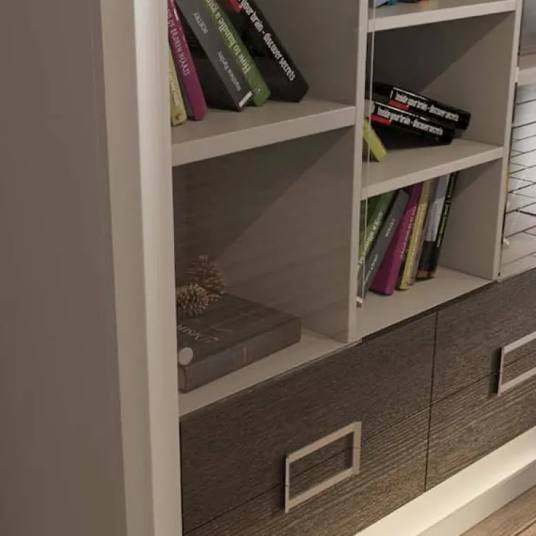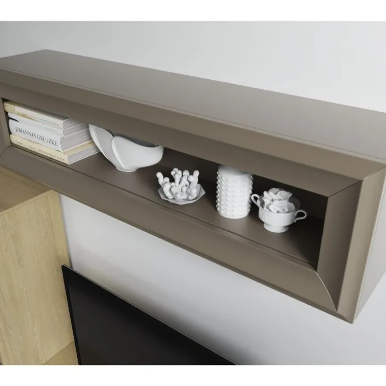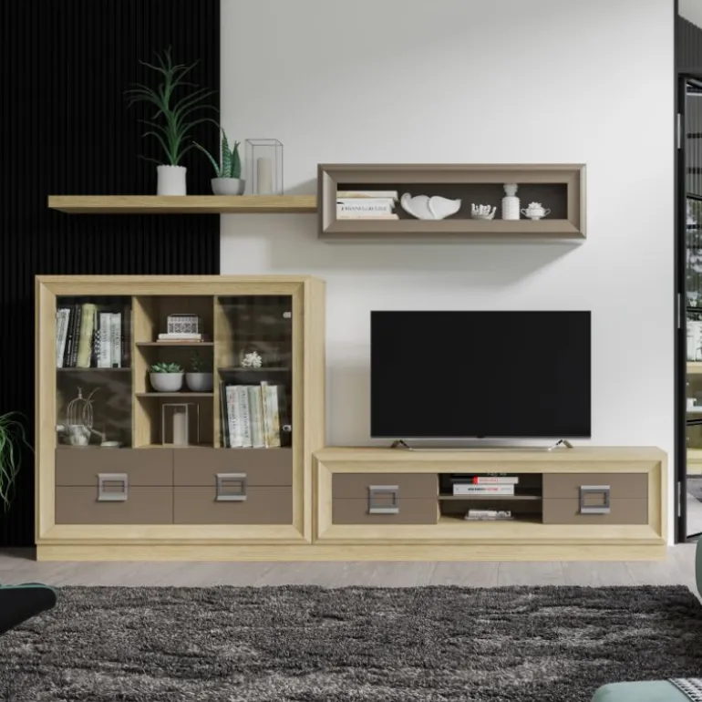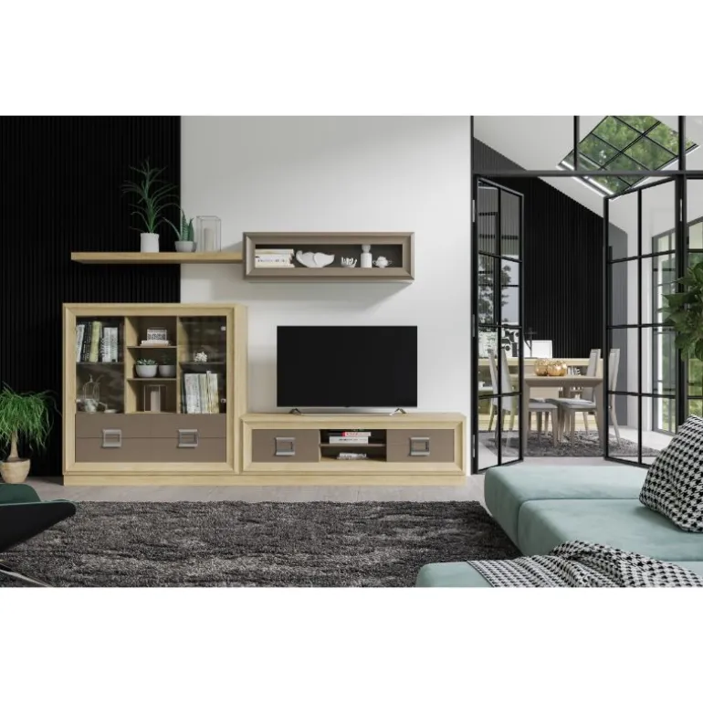 Salón compuesto por un mueble de TV con 4 cajones, una vitrina baja con 4 cajones y 2 puertas de cristal, un puente con puerta de cristal abatible, y un estante de pared. Fabricado en acabado lacado nº61 y chapa de roble natural nº20, que le otorga un contraste muy elegante, moderno y ligero. Y si le sumamos la preciosa vitrina de cristal con el interior del mismo acabado, nos aporta mucho más espacio de almacenaje para que puedas tener todo organizado, y el estante alto da fluidez a las diferentes alturas y completa los elementos decorativos que puedas poner junto con dentro de la vitrina.