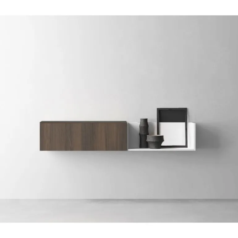 Módulos bajos y TV. Los módulos TV llevan un colgador con SISTEMA ANTIDESCOLGAMIENTO. Innovador sistema de seguridad integrado en la chapa de la pared. Una palanca elástica evita el desacoplamiento accidental del mueble de la pared. La operación de desacoplamiento voluntario es siempre posible haciendo presión en la palanca. Los tacos que forman parte de la estructura del colgador, aumentan su capacidad de carga. Capacidad de carga con certificación LGA de 120 Kg. por colgador. El herraje queda oculto bajo una tapa en la parte interior del mueble.