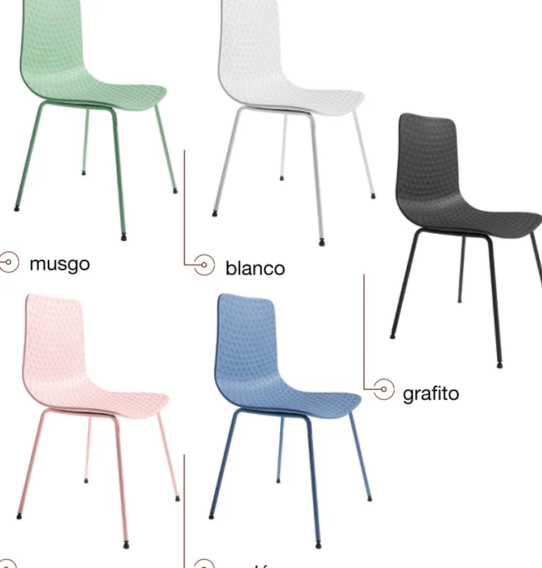 silla smith de comedor de polipropileno muy resistente, apta para exterior y terraza. Con un diseño muy actual, de estilo moderno, pero que encaja en cualquier tipo de decoración a la perfección. Escoge la combinación que encaje mejor con tu estilo, de las posibles combinacionesdiferentes de colores:Blanco, Musgo, Rosa, Azulón o Grafito.