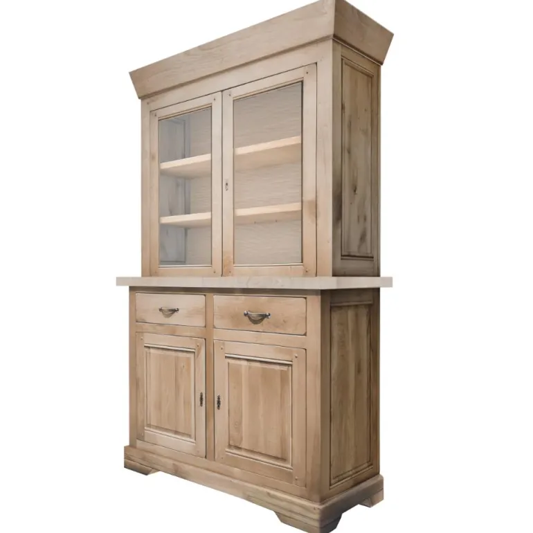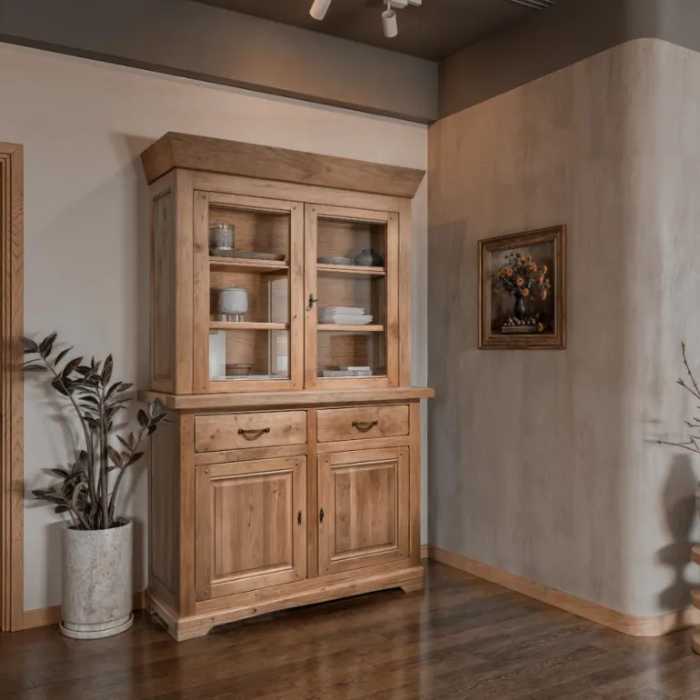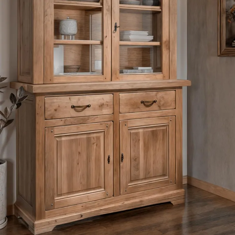 Vitrina de 2 puertas y alacena con 2 cajones y 2 puertas, fabricada en madera maciza con cerradura con llave, color oro envejecido. Está compuesta de 2 puertas acristaladas con cristales transparentes y en la parte superior. Las baldas interiores con sistema de cremallera artesanal para situar a la altura deseada. Y además tapa plafonada contra movimientos producidos por contrastes de temperatura.