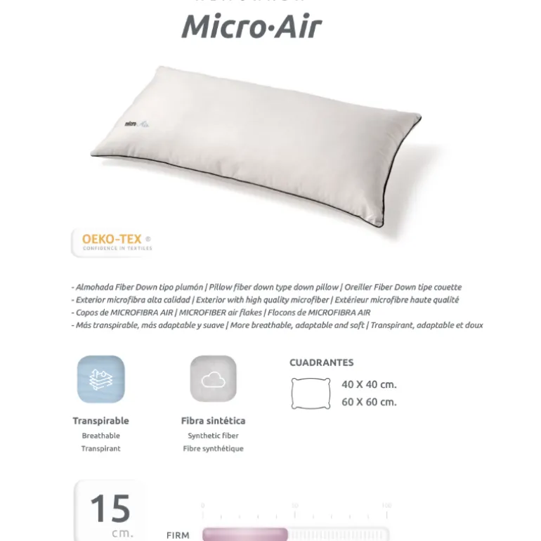 Almohada Fiber Down tipo plumón con Exterior microfibra alta calidad, Copos de MICROFIBRA AIR. Más transpirable, más adaptable y suave.