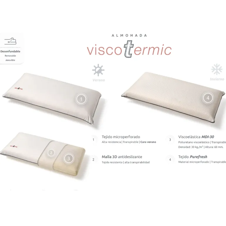 Almohada con núcleo de Viscoelástica MDI·30. Poliuretano viscoelástico | Transpirable con densidad: 30 kg./m3. Que conserva la postura natural gracias a el efecto memory foam de la viscoelástica.