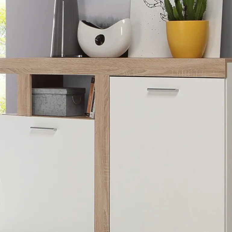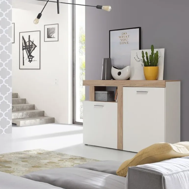 Una combinación de colores neutros muy actual en ecomadera de roble aserrado y blanco mate, que permiten encajarlo fácilmente en cualquier decoración.
