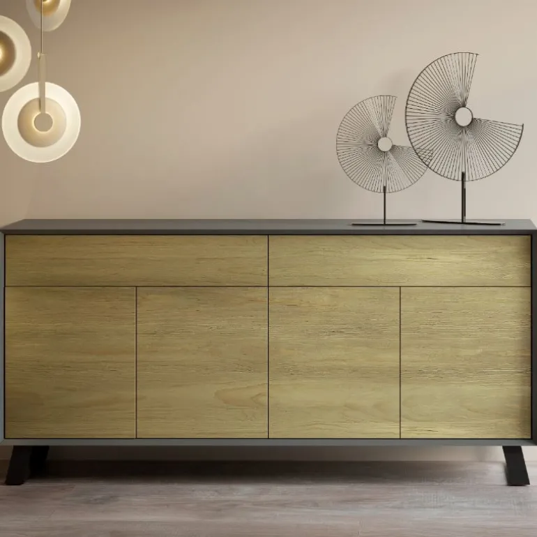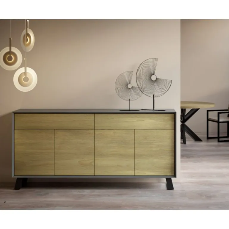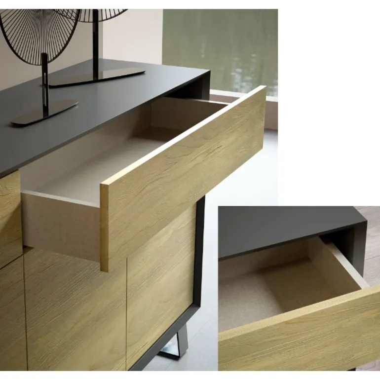 El mueble puede escogerse en varios colores Lacados para la estructura y Maderas macizas o Lacados para las puertas y cajones, y las patas metálicas en Negro Mate, Blanco Mate. Dispone del mueble de TV atemporal a juego en la misma web.