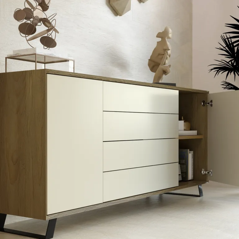 Aparador de fabricación artesanal, con opción de acabado en diferentes maderas del muestrario. Foto en acabado Lacado Blanco Mate y Madera Tostado Medio, con patas de Metal Negro Mate.