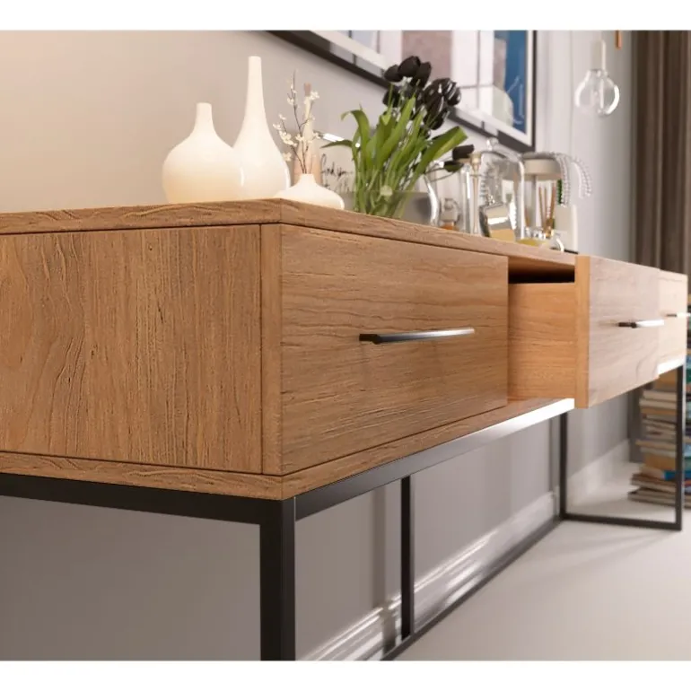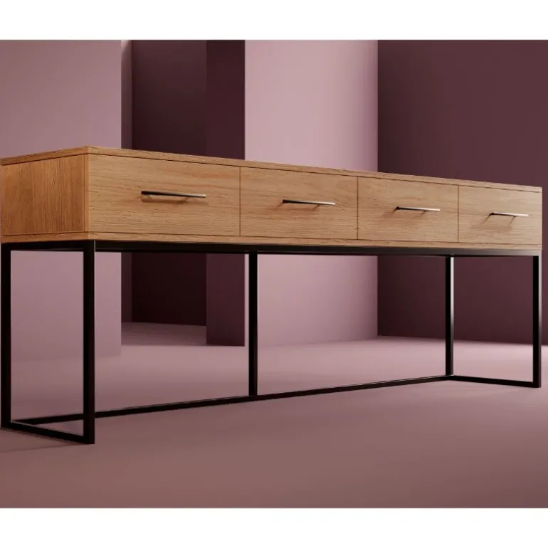 Aparador Benín de fabricación artesanal, con opción de acabado en diferentes maderas del muestrario. Foto en acabado Madera Gris Intenso, con patas de Metal Negro Mate.