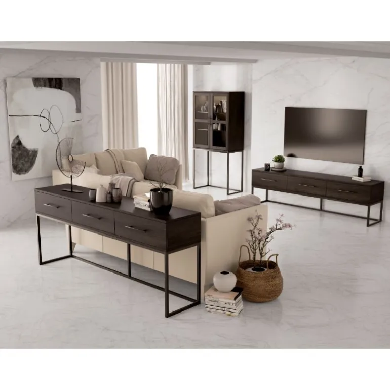 El mueble puede escogerse en varios colores Lacados para la estructura y Maderas macizas o Lacados para las puertas y hueco diáfano, y las patas metálicas en Negro Mate o Blanco Mate. Dispone del mueble de TV Benín a juego en la misma web, así cómo vitrina alta Benín.
