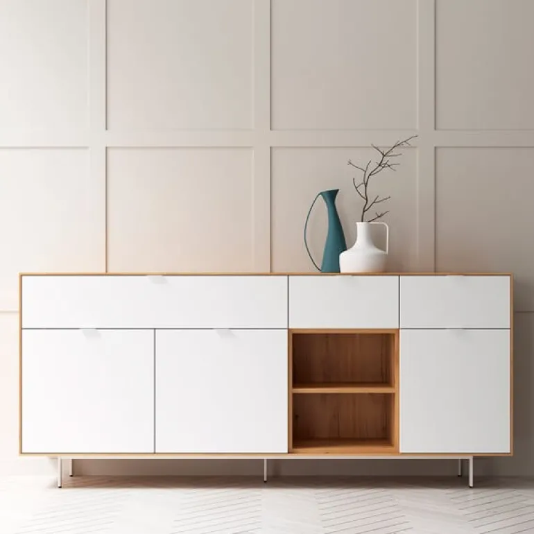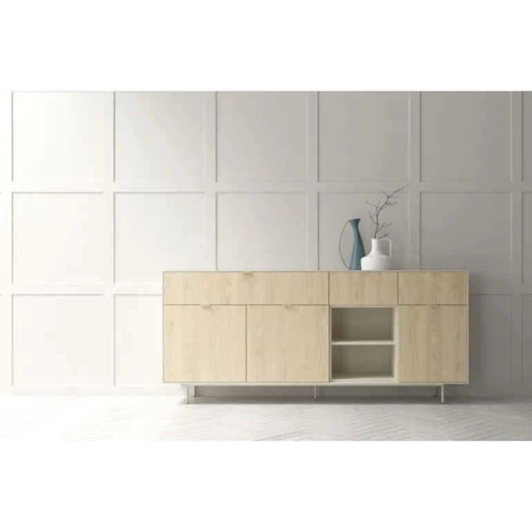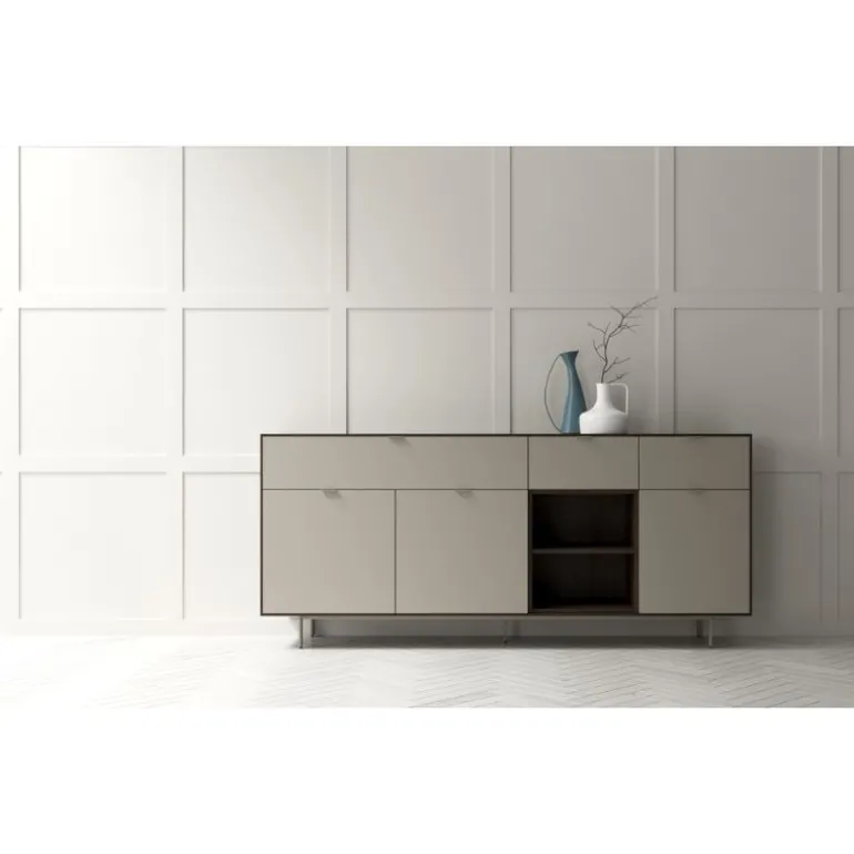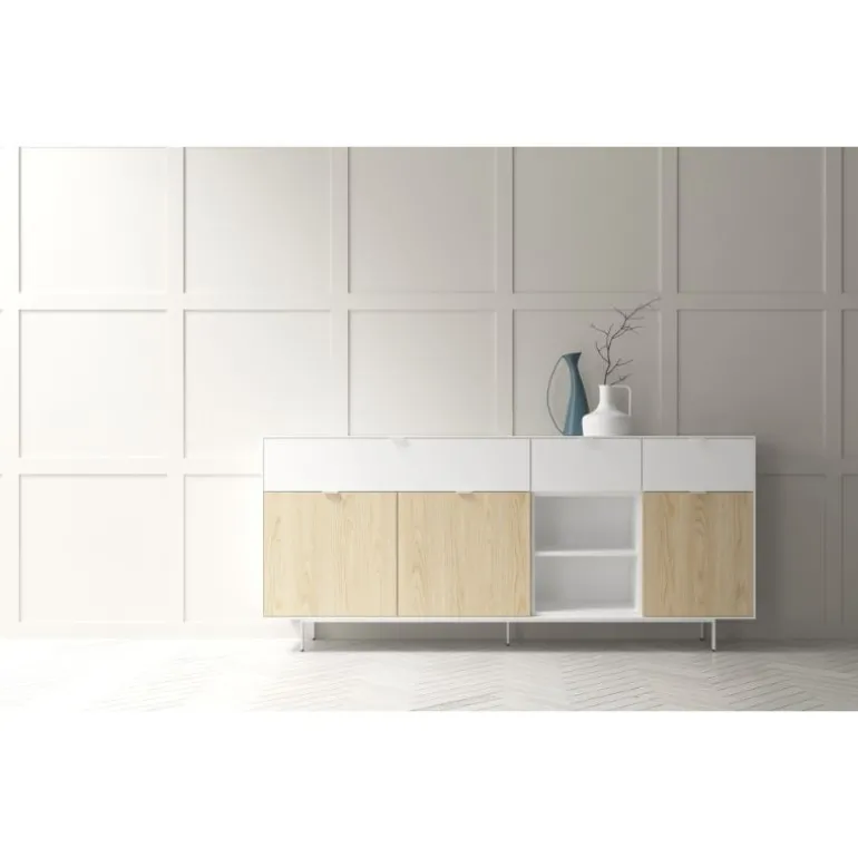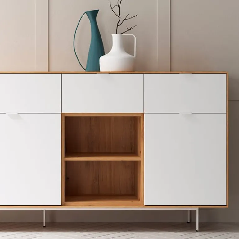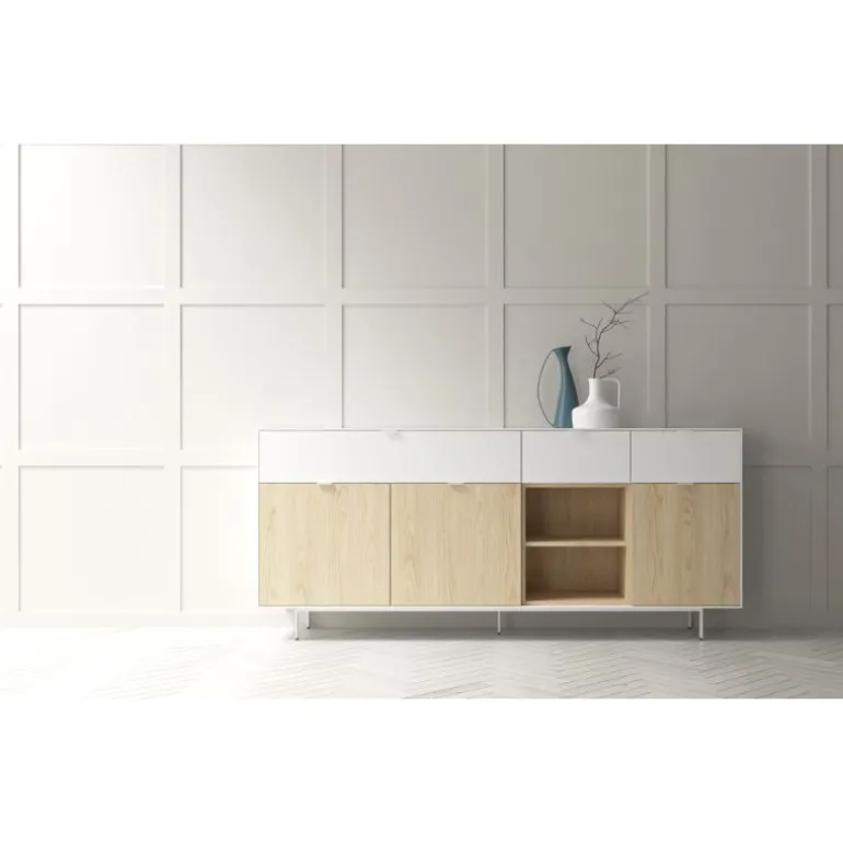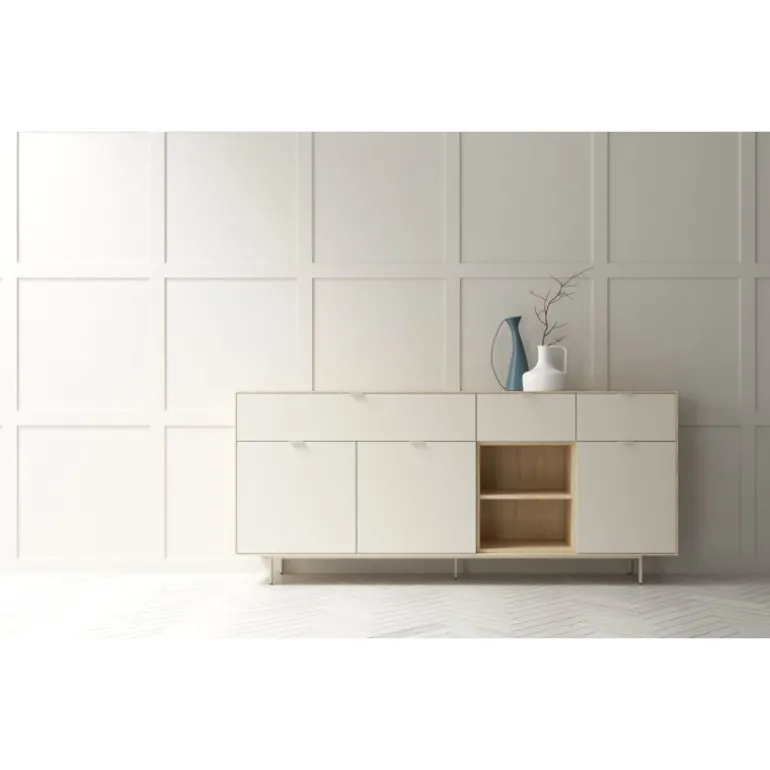 Aparador perfecto para completar cualquier estancia y poder tenerla recogida. Con bancada de patas metálicas y estructura de 1 cm de grosor. Con 3 cajones, 3 puertas y un hueco libre con balda, podrás organizar todas tus cosas como quieras. En diferentes acabados melamínicos en maderas o laminados lisos. Tiradores discretos Line.