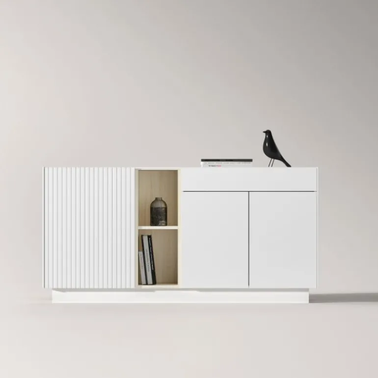 Aparador Blanco Seda. Estupendo mueble para el salón / comedor que destaca por sus acabado con franjas laminadas en blanco, diferente a la mayoría de muebles que podemos ver, vanguardista, recto muy elegante. Compuesto por tres puertas y un cajón. Todo ello con zócalo de 10 cm.