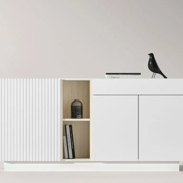 Aparador Blanco Seda dispone de sistema de absorción en cajones y puertas, para evitar golpes indeseados, con un simple empujón el cajón se cerrará solo y silenciosamente.