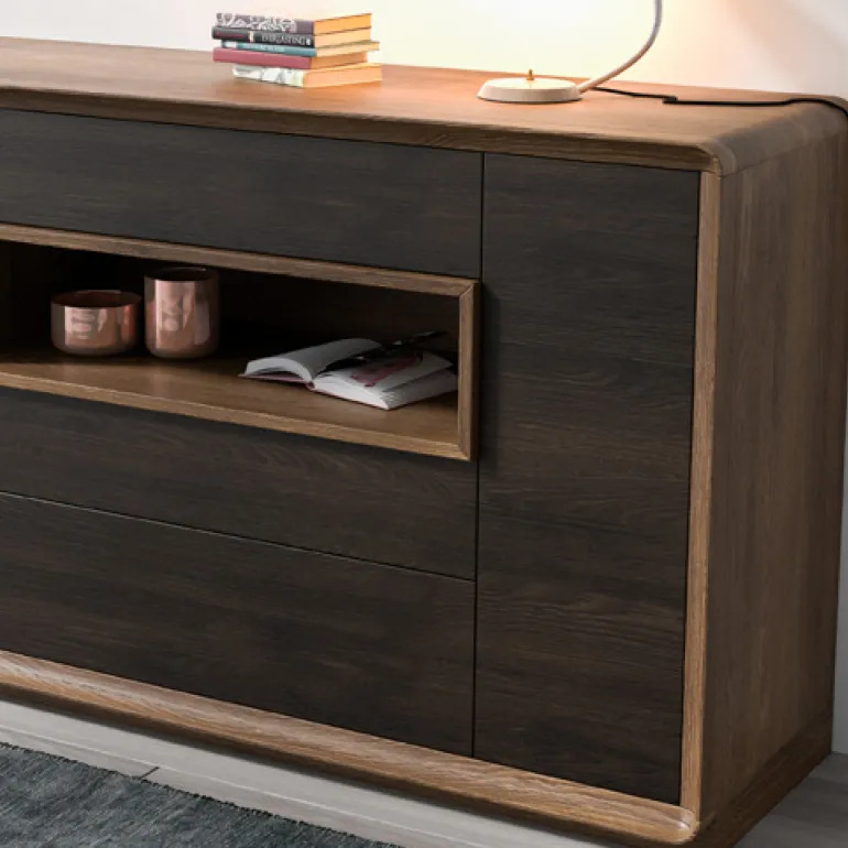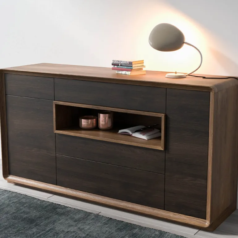 Aparador con2 puertasy4 cajones. Con aperturade pulsador. Con un hueco diáfano para adornos o más almacenaje.El modelo de la imagen está en acabado en Roble N1 para el armazón yRoble N7 para las puertas y cajones,que le otorga un contraste entre chasp de Roble muy moderno y ligero. Pero puede escogerse en diferentes acabados combinando al gusto.
