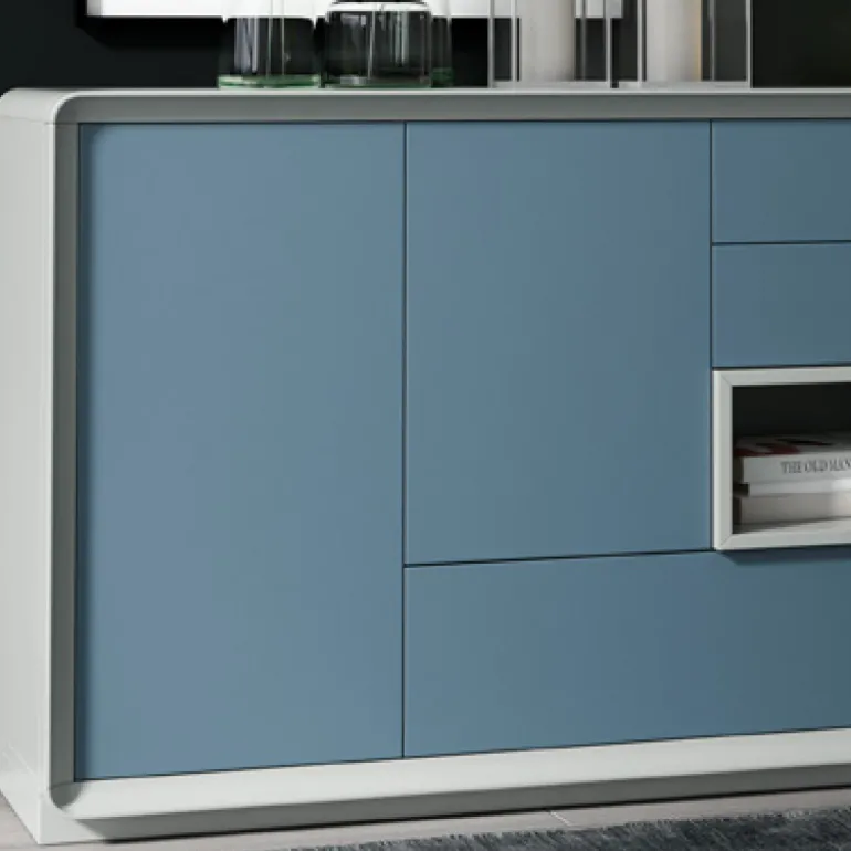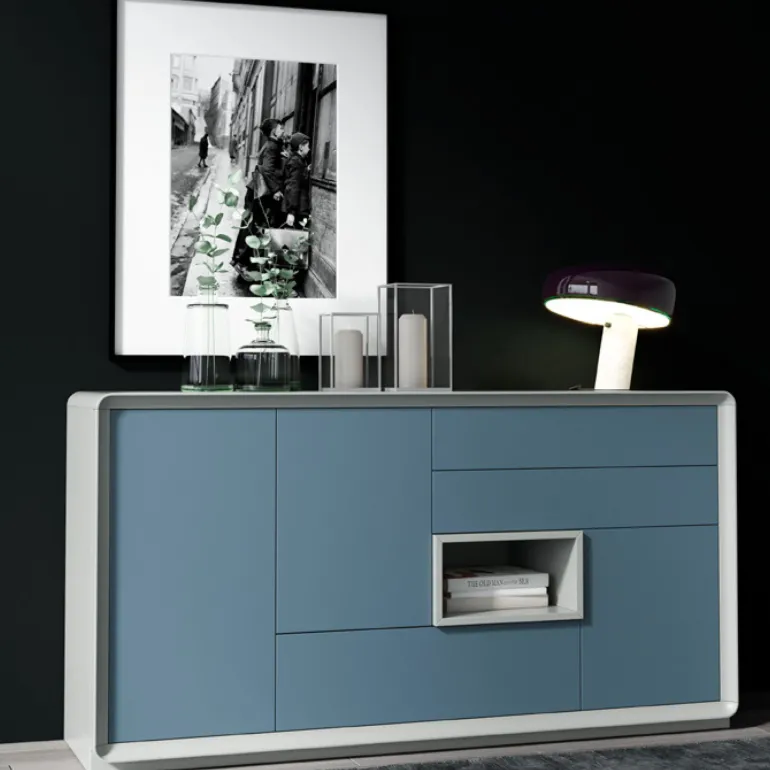 Aparador con3 puertasy 3 cajones. Con aperturade pulsador. Con un hueco diáfano para adornos o más almacenaje.El modelo de la imagen está en acabado en Lacado N64 para el armazón y Lacado N67 para las puertas y cajones,que le otorga un contraste muy moderno y ligero. Pero puede escogerse en diferentes acabados combinando al gusto.
