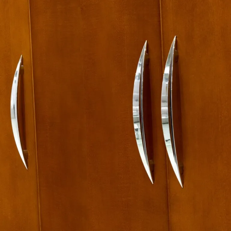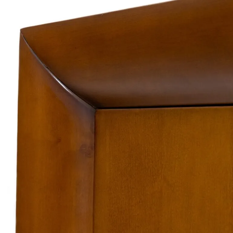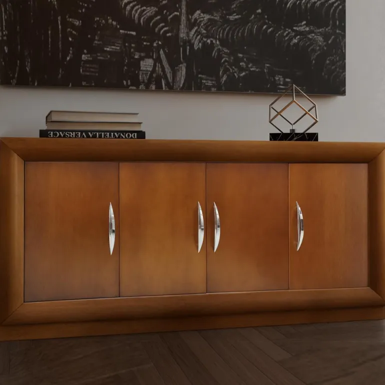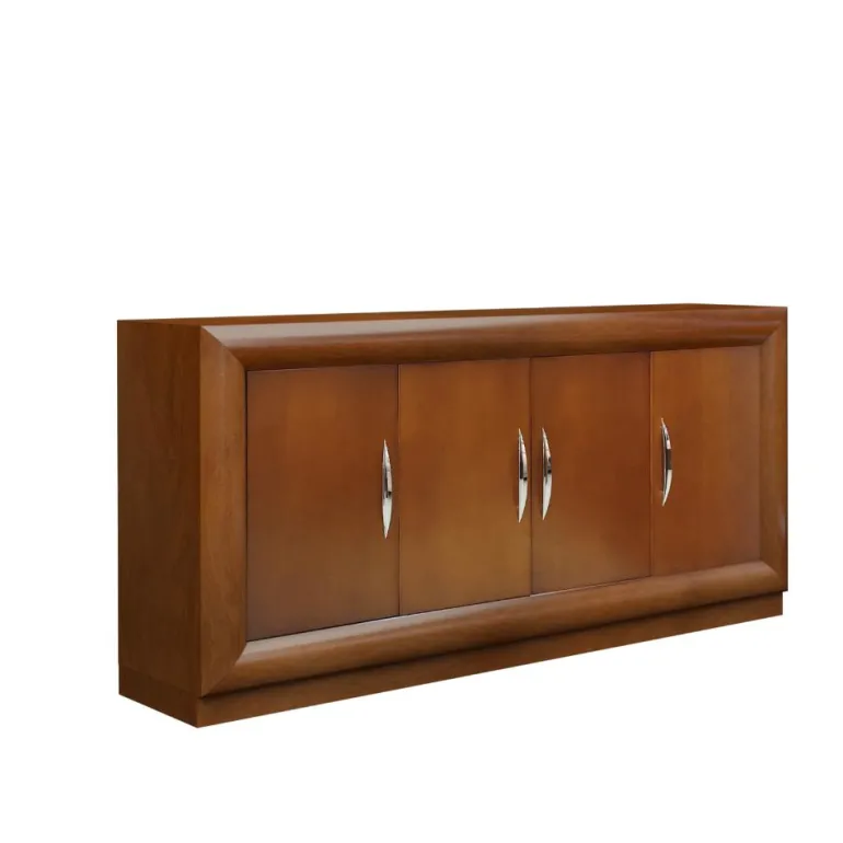 Aparador bajo en chapa natural Aliso (familia cerezo) color cerezo suave al tacto, y patinado para resaltar sus molduras. Gran calidad y durabilidad, con 4 puertas abatibles y tiradores cromados.