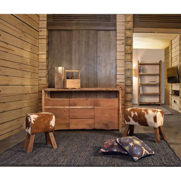 Madera maciza tratada. Tratamiento especial de la madera, desgastamos la veta blanda para que el relieve sea mayor apreciable a la vista y al tacto, y relieves tallados en madera. Mix entre lo antiguo y lavanguardia del mobiliario.