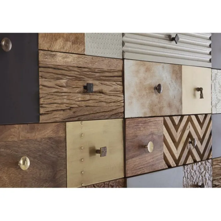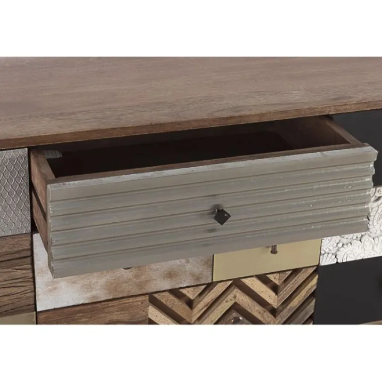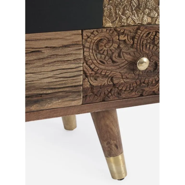 Estructura de madera de mango con la parte trasera de dm. Frente de laspuertas de madera reciclada mango y acacia. Estructura de los cajones demango y acacia. acabado con barniz a base de agua. tiradores de acero. en elinterior una balda.