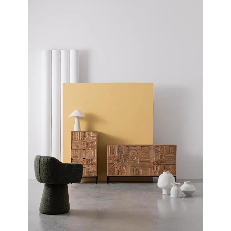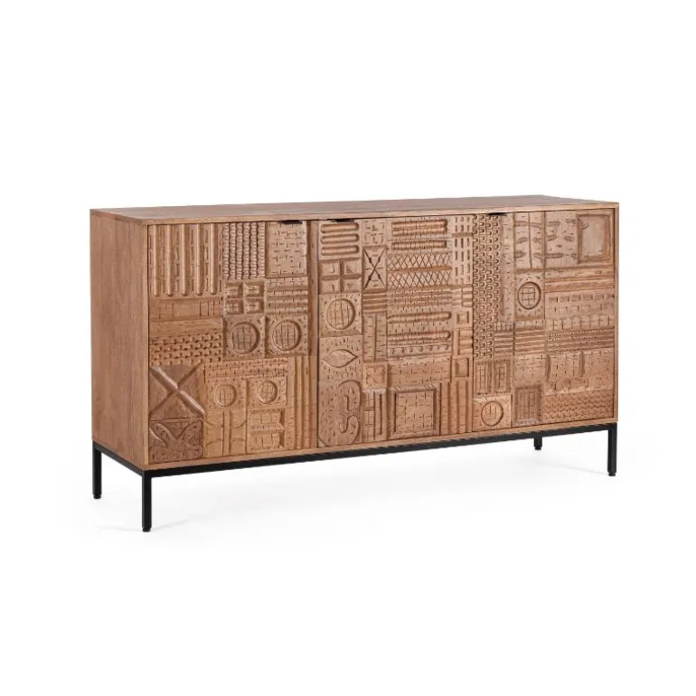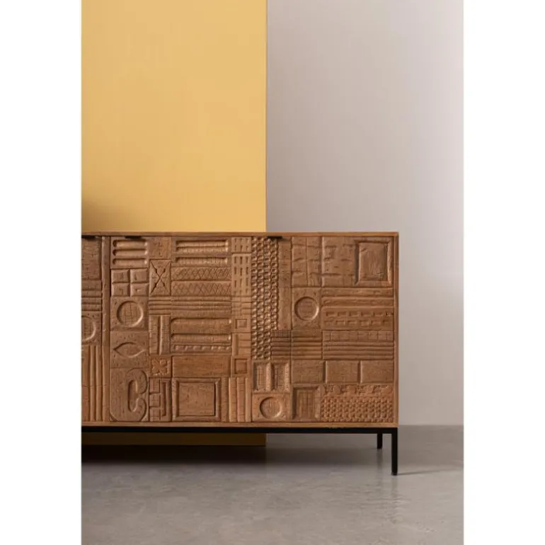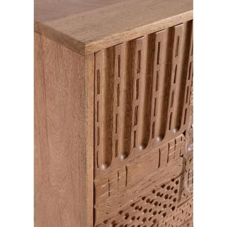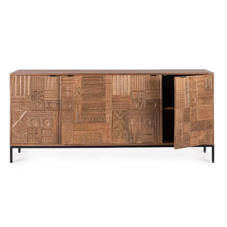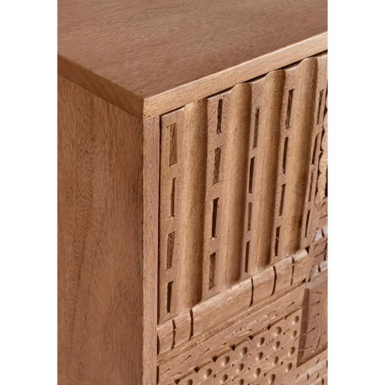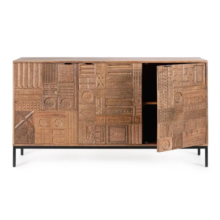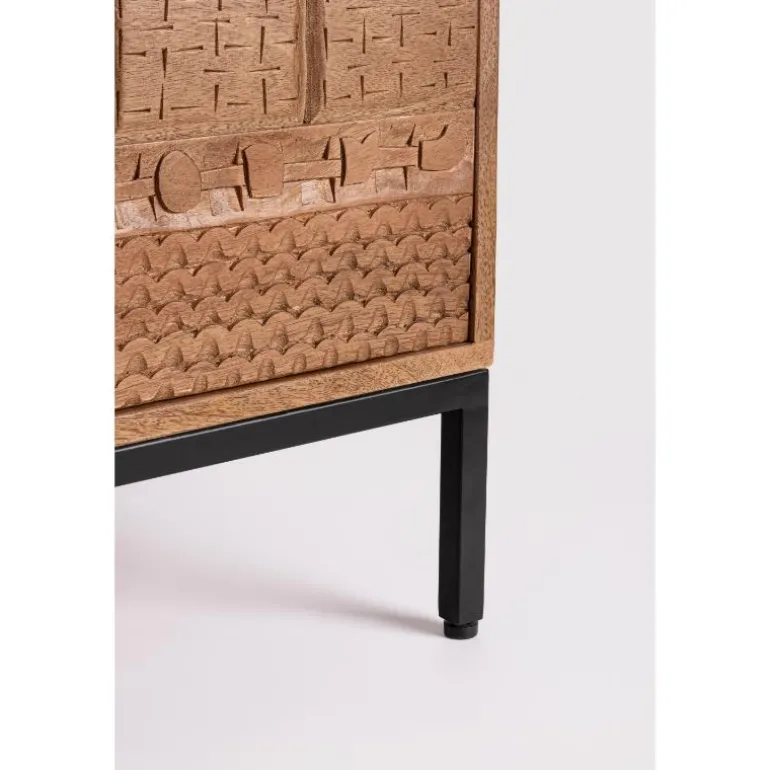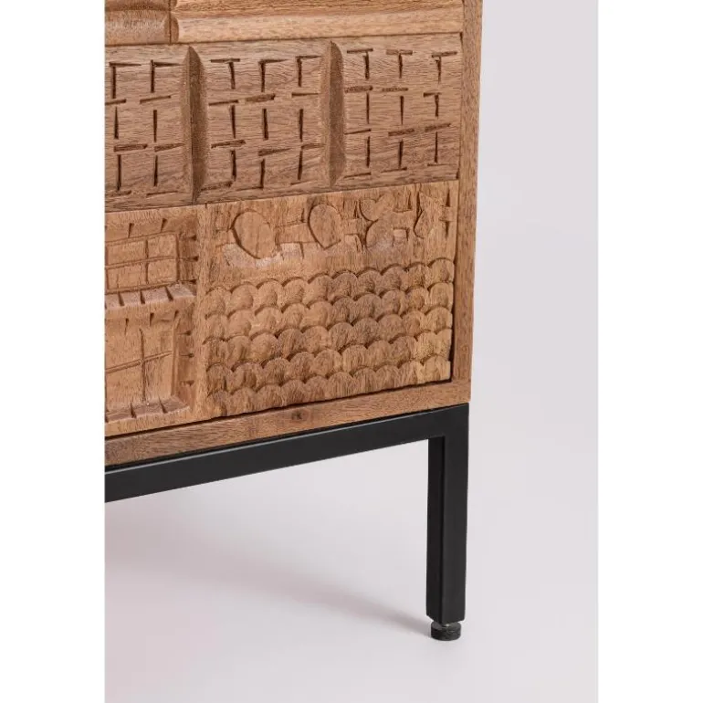 Estructura de madera de mango maciza. Trasera de DM. Acabado a base de nitrocelulosa. Patas y tiradores de acero negras. Frentes de los cajones y puertas con incrustaciones y tallas hechos a mano. Interior de las puertas con un estante en cada una de las mismas.