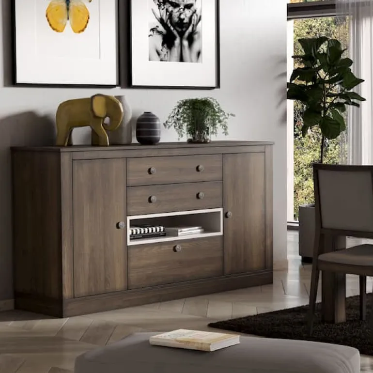 Aparador en chapa de roble natural con dos cajones superiores, un cajón grande bajo y 2 puertas, fabricado en ecomaderaRoblenatural nº1 difuminado, con un hueco central en acabado lacado crema, que le otorga un contraste muy elegante,moderno y ligero. Con el alto profundo para poder poner elementos decorativos.