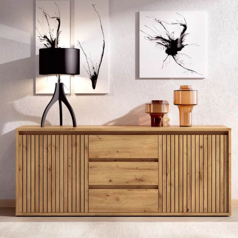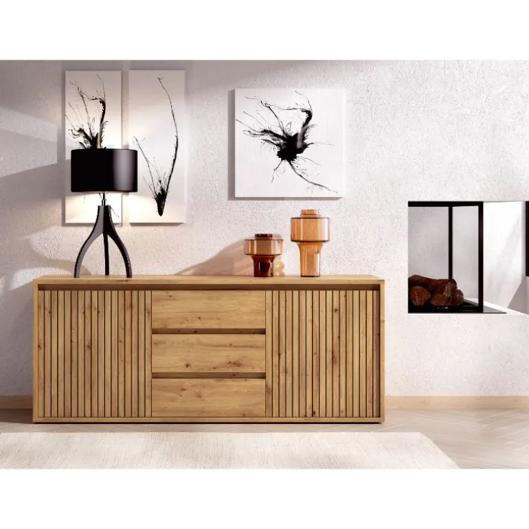 Este aparador moderno con mucha capacidad de almacenaje, gracias a sus numerosos compartimentos de almacenaje, con 3 cajones, 2 puertas abatibles. Es posible seleccionar diferentes apoyos, y además también ofrece muchas posibilidades de personalización con los diferentes acabados.
