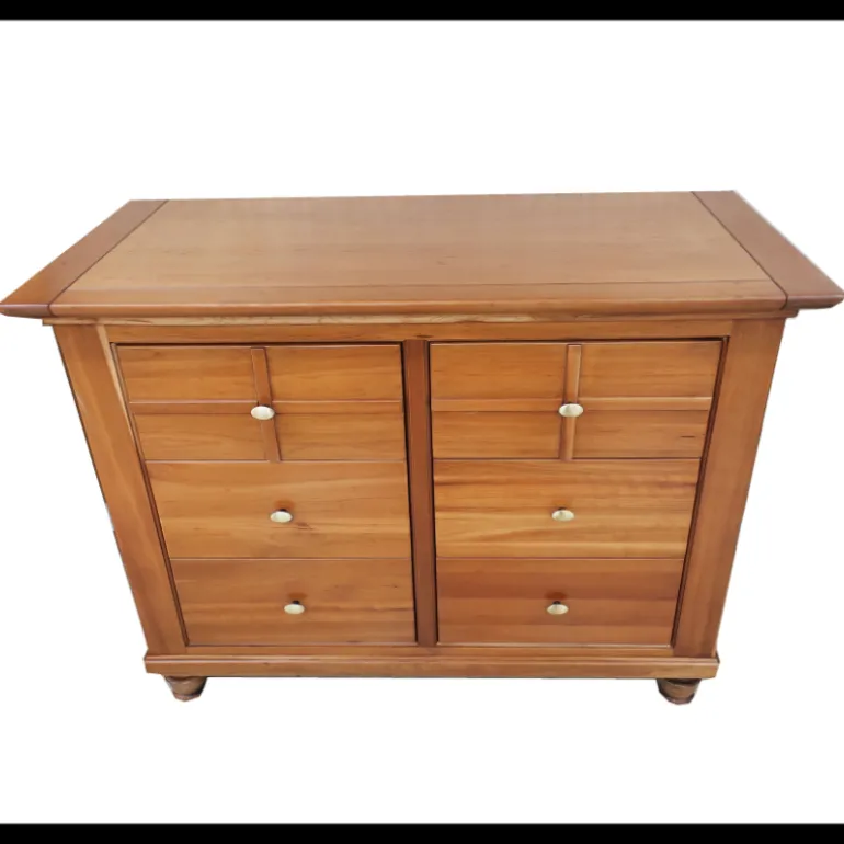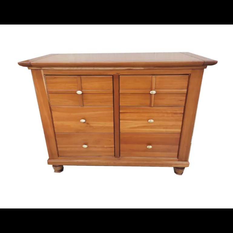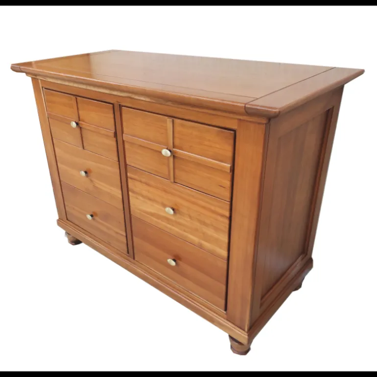 Rústico aparador de 6 cajones con detalle de madera en los superiores, para poder almacenar todo aquello que necesites. Esta fabricado en madera de Cerezo maciza, en un preciosos tono rojizo del Cerezo, con acabado natural de tacto fino y tiradores de hierro forjado pulidos.