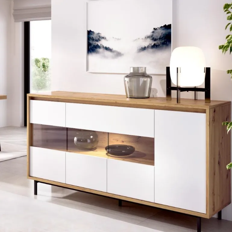 Aparador con preciosa vitrina en puerta abatible que le confiere un diseño más moderno. Además de 2 cajones y 4 puertas donde poder guardar más cosas.