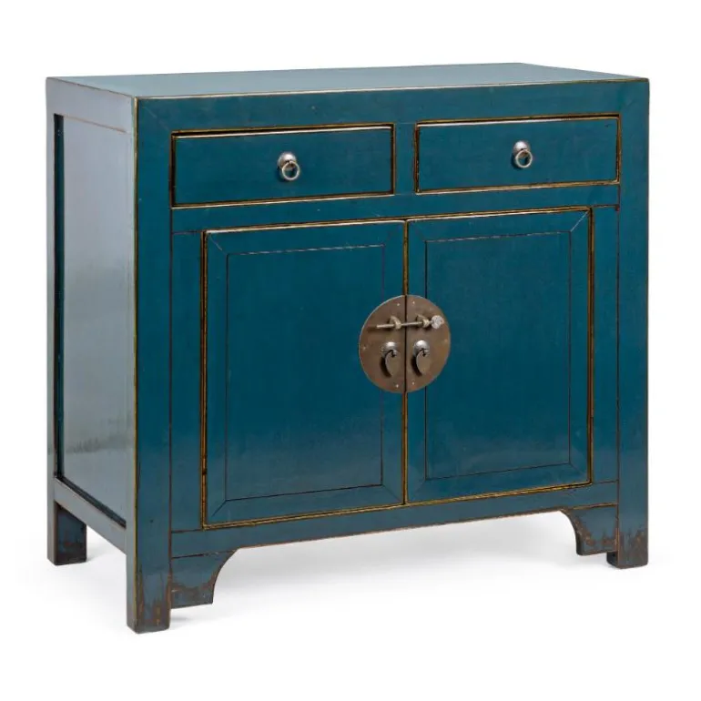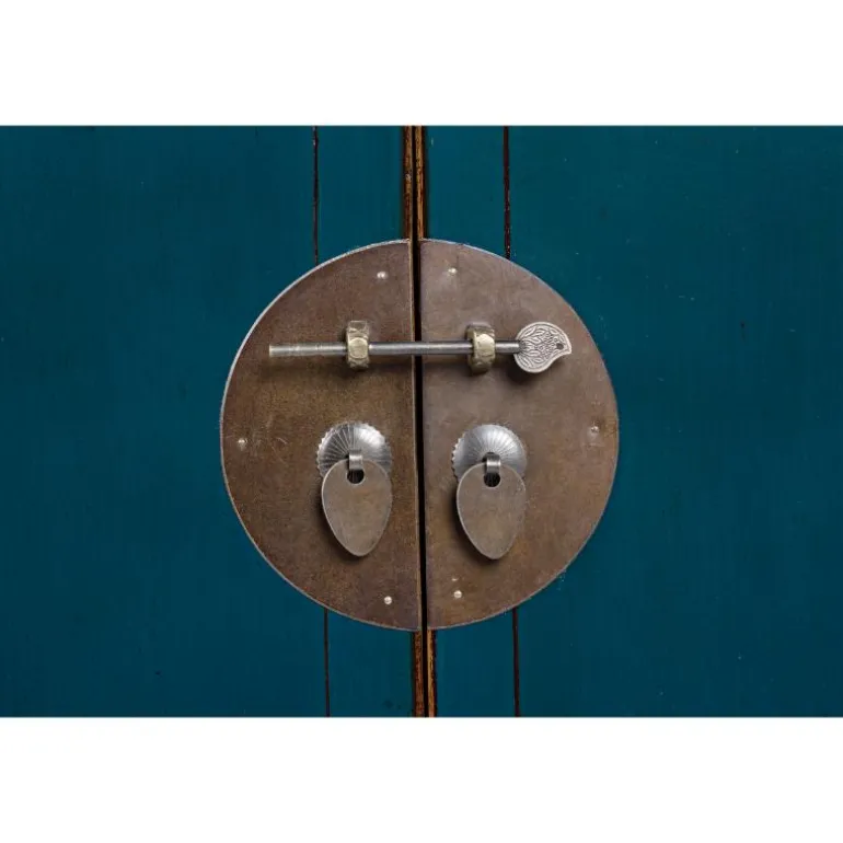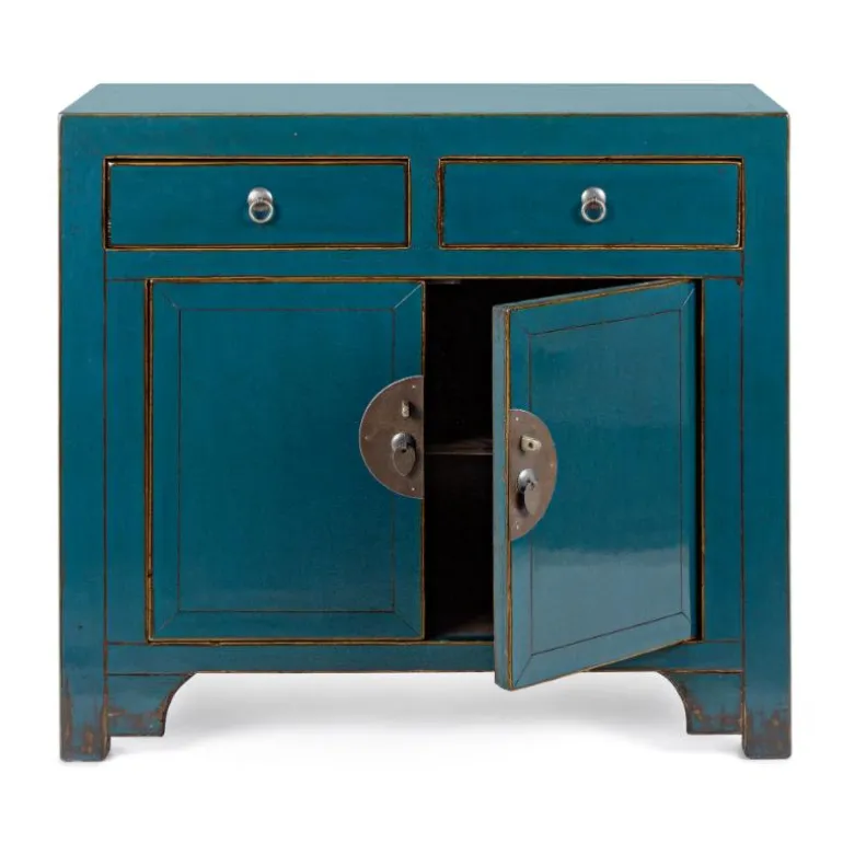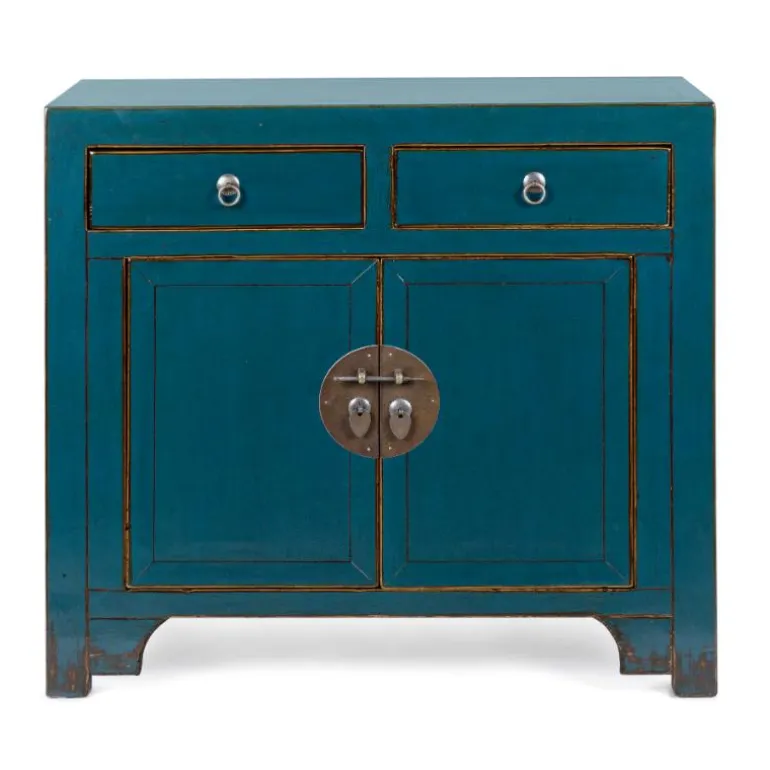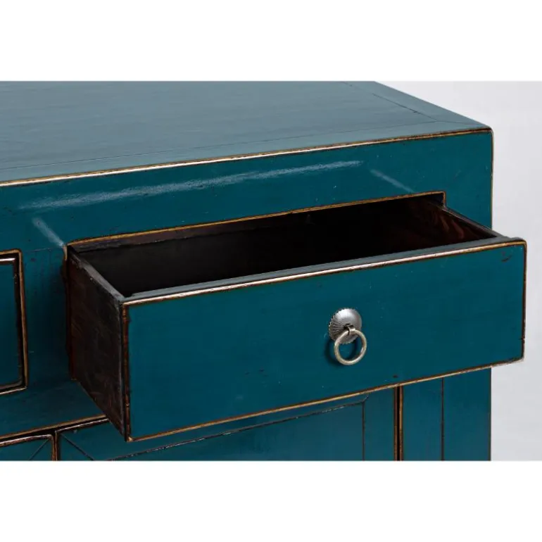 Estructura de madera de olmo maciza. Acabado azul brillo patinado a base de agua. Tiradores de cobre típico asiático.