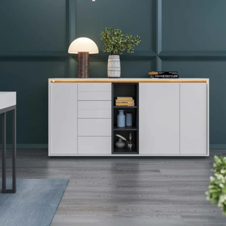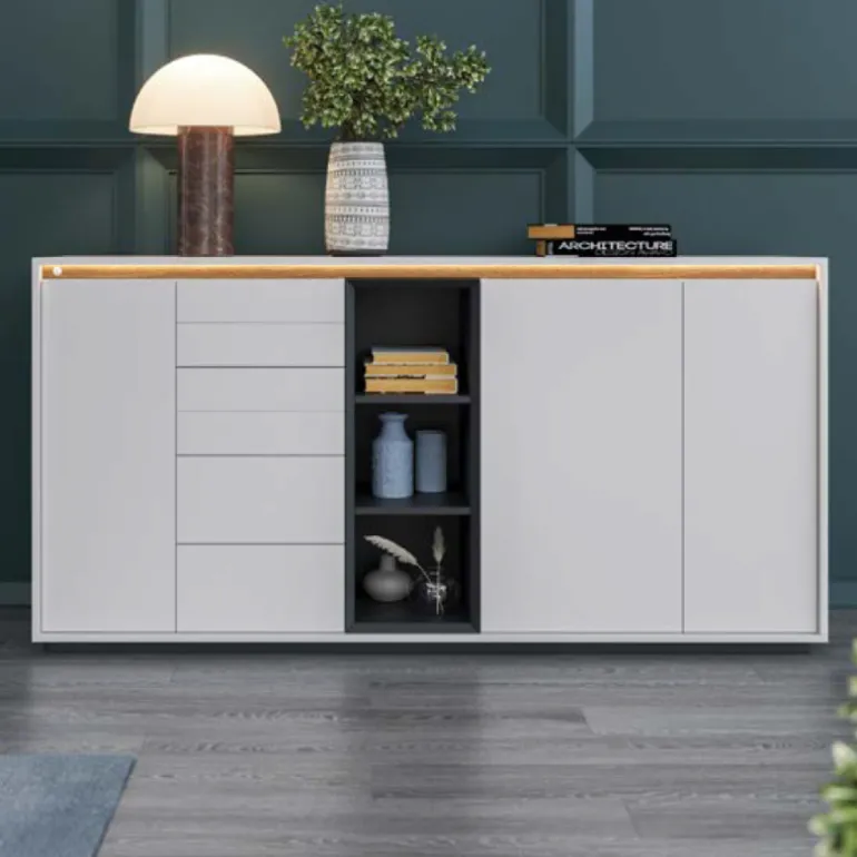 Aparador moderno Dominic fabricado en acabado Lacado y chapa natural de roble natural, con tiradores de pulsador, que dejan todo el frontal limpio y elegante, los cajones cuentan con guías con freno de absorción para evitar golpes bruscos y pillarse los dedos, sistemas de retención y apertura push.