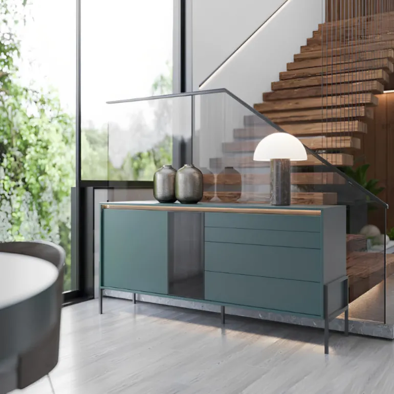 Aparador moderno Saboga fabricado en acabado Lacado y chapa natural de roble poro abierto, con tiradores de pulsador, que dejan todo el frontal limpio y elegante, los cajones cuentan con guías con freno de absorción para evitar golpes bruscos y pillarse los dedos, sistemas de retención y apertura push.