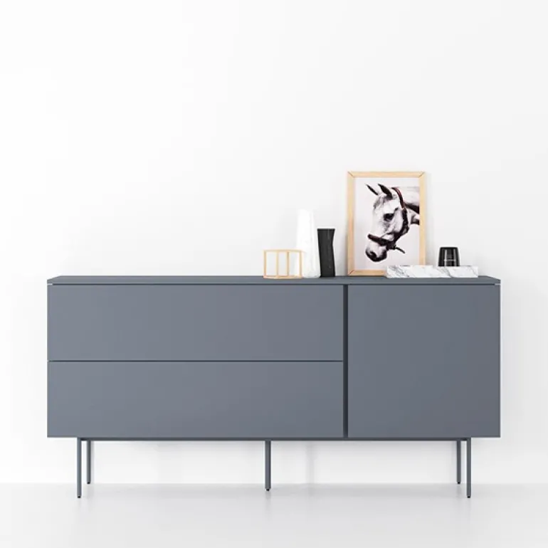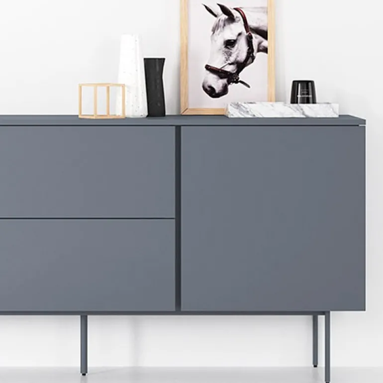 Un aparador de lineas minimalistas y modernas con dos grandespuertas abatibles y una puerta derecha.