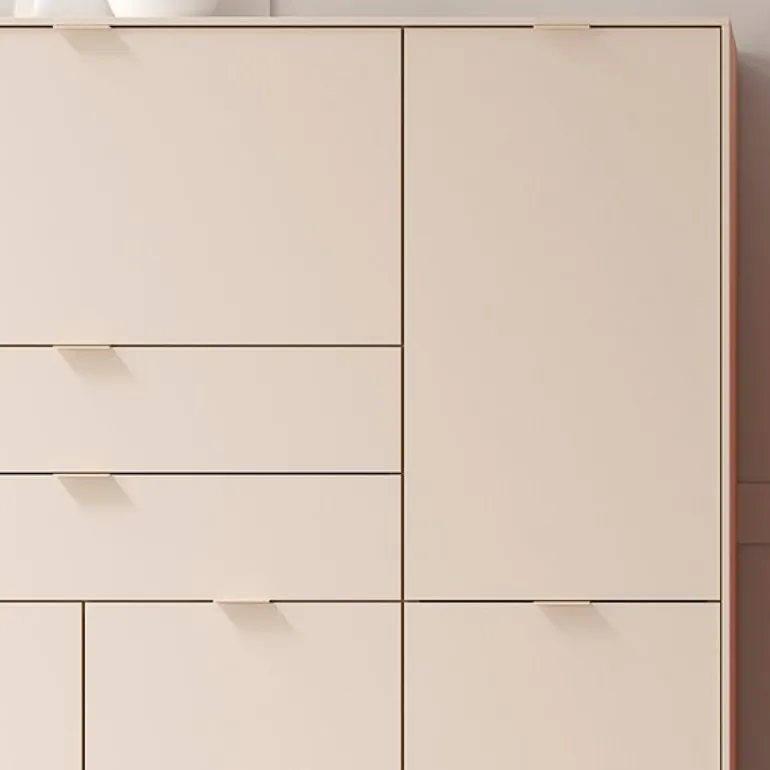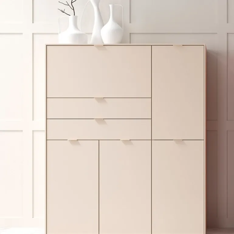 Aparador de diseño con gran cantidad de espacios para tener todo bien ordenado. Cuenta con 5 puertas, una de ellas abatible y dos cajones, que abrirás con un discreto pero práctico tirador. La estructura es de 1 cm de grosor, apartando así una calidad de fabricación muy buena y un estilo muy vanguardista. En diferentes acabados melamínicos en maderas o laminados lisos. Con tiradores discretos line.