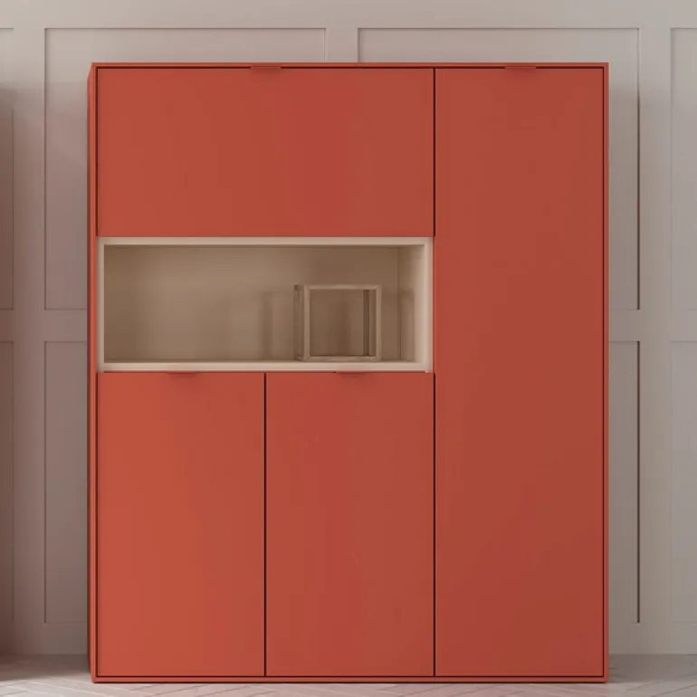 Moderno aparador de diseño con 4 amplias puertas que te permitirán guardar todo lo que necesites para mantener tu salón organizado. Una de ellas abatible y las otras 3 de apertura lateral con unos discretos tiradores. La estructura es de 1 cm de grosor, apartando así una calidad de fabricación muy buena y un estilo muy vanguardista. En diferentes acabados melamínicos en maderas o laminados lisos. Con tiradores discretos Line.
