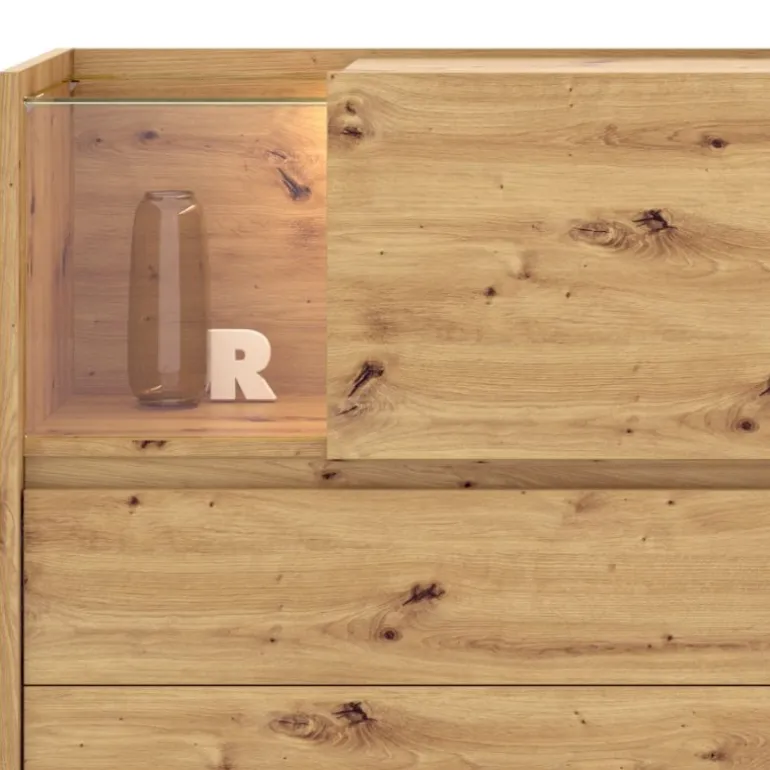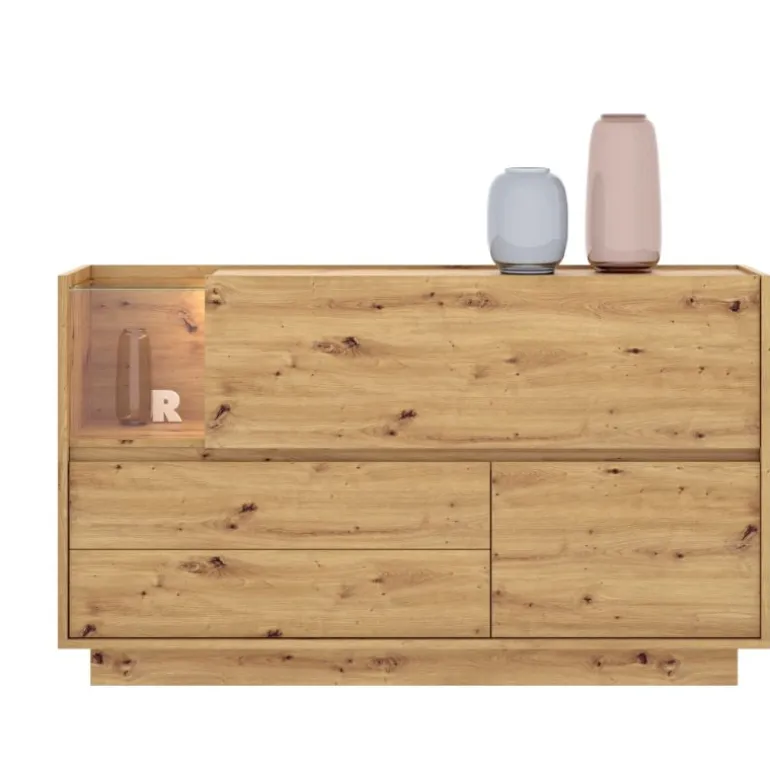 Aparador Nui zócalo, de diseño moderno muy completo puesto que además de 1 puerta batiente y 2 cajones muy prácticos en su parte inferior y una puerta abatible de buenas dimensiones superior, tiene un bonito hueco con cristal que se abre con la puerta batiente, en cuyo interior se le puede poner iluminación LED, que hace que este aparador tenga un diseño impecable. La opción de 120cm, en lugar de cajones dispone de otra puerta batiente.