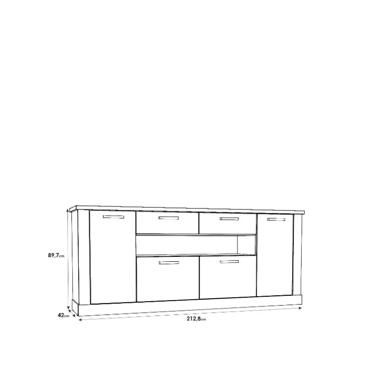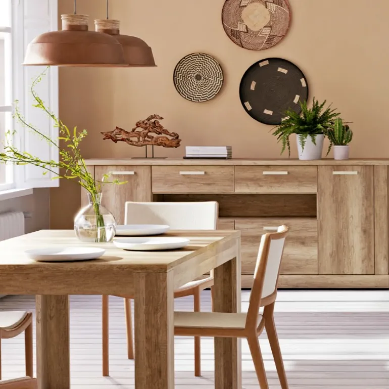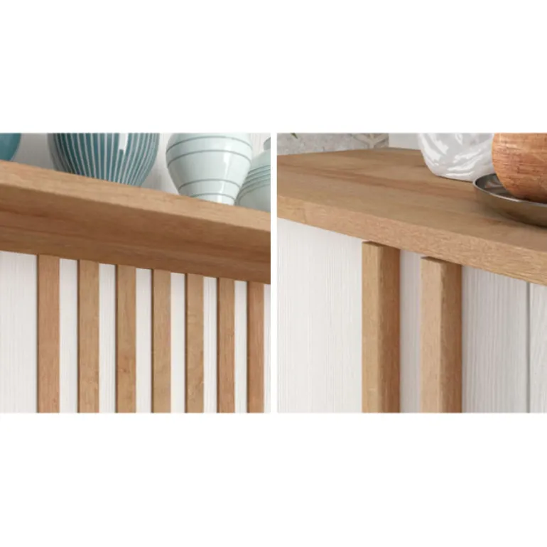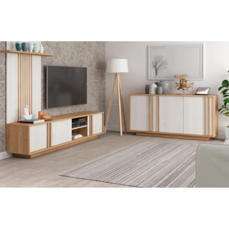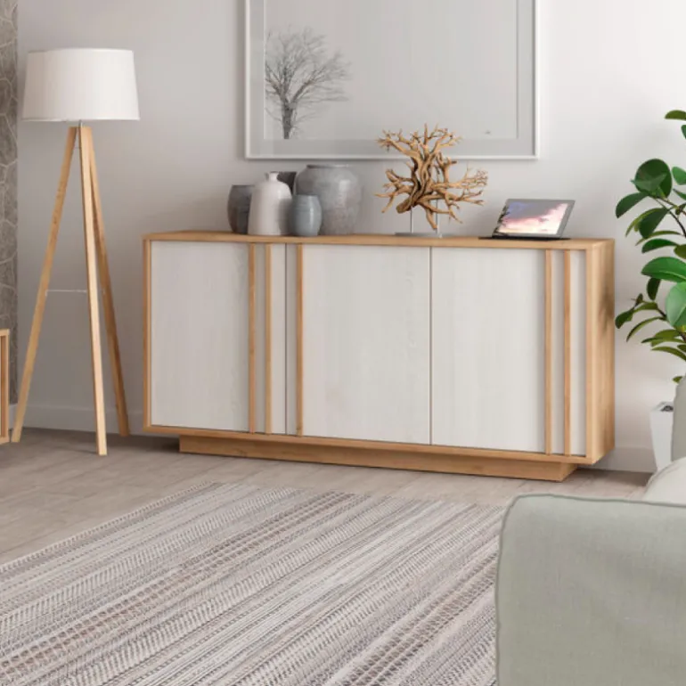Aparador Roble River está fabricado en ecomadera, blanco poro con la veta de la madera y Roble natural, con 3 puertas amplias y mucho espacio de almacenaje. Con un diseño actual que combinan a la perfección con cualquier espacio y mobiliario.