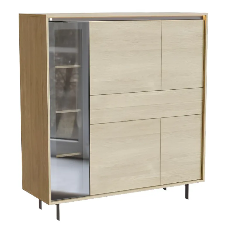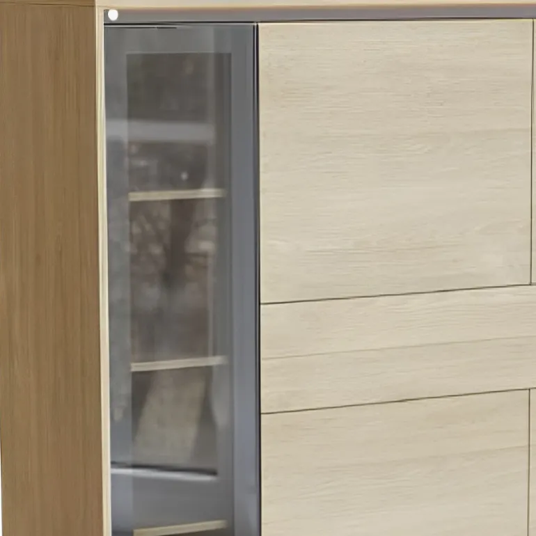 Aparador vitrina Dylan fabricado en acabado Lacado y chapa natural de roble natural, con tiradores de pulsador, que dejan todo el frontal limpio y elegante, los cajones cuentan con guías con freno de absorción para evitar golpes bruscos y pillarse los dedos, sistemas de retención y apertura push.