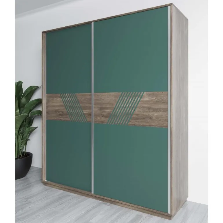 Armario para dormitorio de matrimonio con 2 puertas correderas, acabado Lacado Verde N69 para el Frente de puertas, y ROBLE N1 el Armazón y el detalle de la zona central, con opción de toda la puerta del mismo color y el Detalle de otro color. Colores que le otorga un contraste muy moderno y ligero. Perfecto para dormitorios de matrimonio modernos.