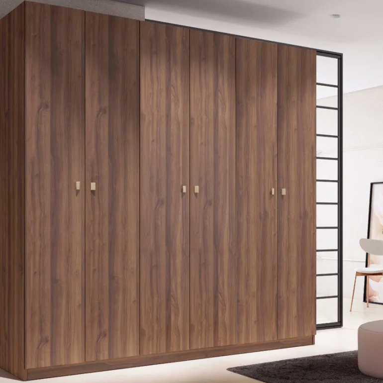 Armario a medida Nogal, encaja en cualquier habitación de adulto o juvenil y su composición no cansa. Esta composición de armario cuenta con sistema de guías auto-freno en las 6 puertas.