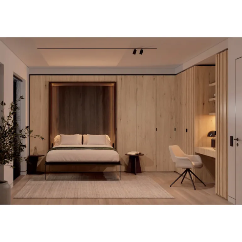 Y por la noche, el espacio destinado al relax con una cómoda banqueta, se convierte rápidamente en una cama abatible doble con luces LED integradas en los laterales. Las dos mesas auxiliares se convierten a su vez en dos sencillas mesitas de noche.