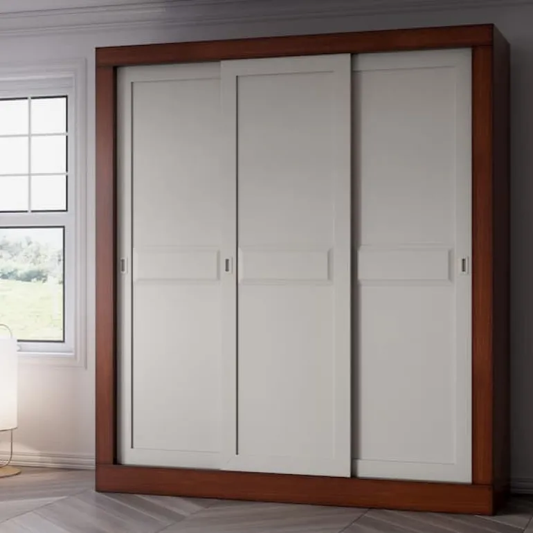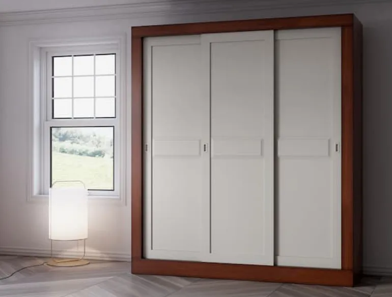Armario en acabado en chapa roble nº3 difuminado y las puertas en lacado crema,una combinación de acabados muy moderna y elegante.