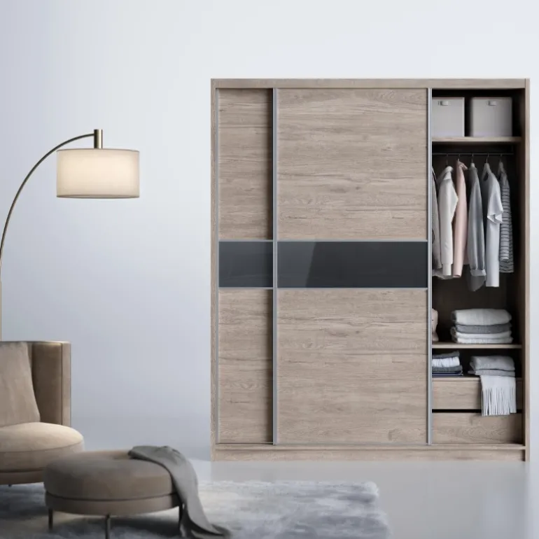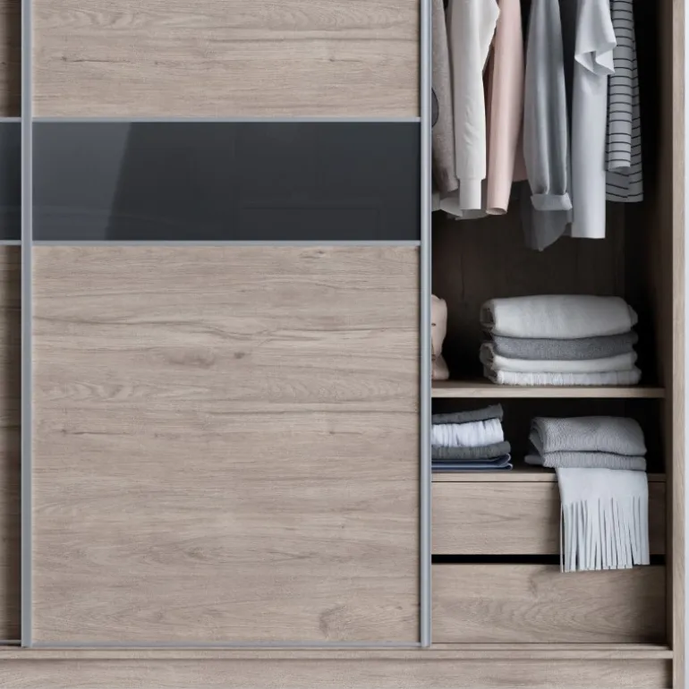 Armario corredero Supra moderno con puertas bicolor para dormitorio de matrimonio, fabricado en ecomadera con posibilidad de personalizar entre los acabados disponibles. Con una distribución interior ideal, hacen de este conjunto una opción muy recomendable para guardar toda la ropa.