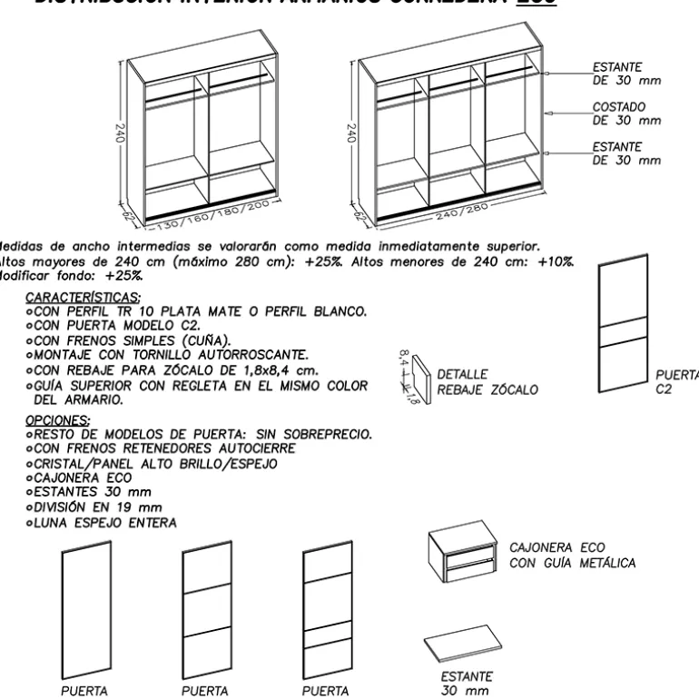 Armario corredero Supra dispone de 3 distribuciones interiores estándar según medidas a escoger: PROMO (para armarios de 220cm de alto), y ECO y SUPRA (para armarios de 240cm de alto). Pero se pueden añadir cajoneras y complementos adicionales. Precio para distribución interior modelo SUPRA, con cajonera de 2 cajones baldas y colgadores.