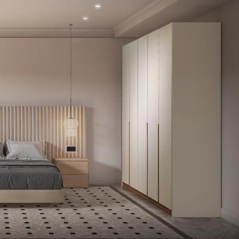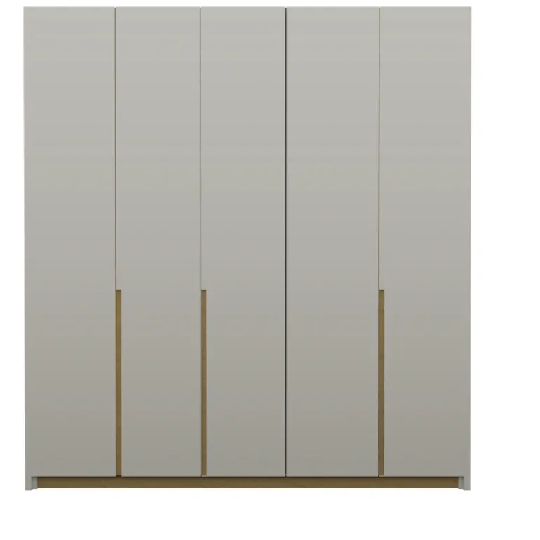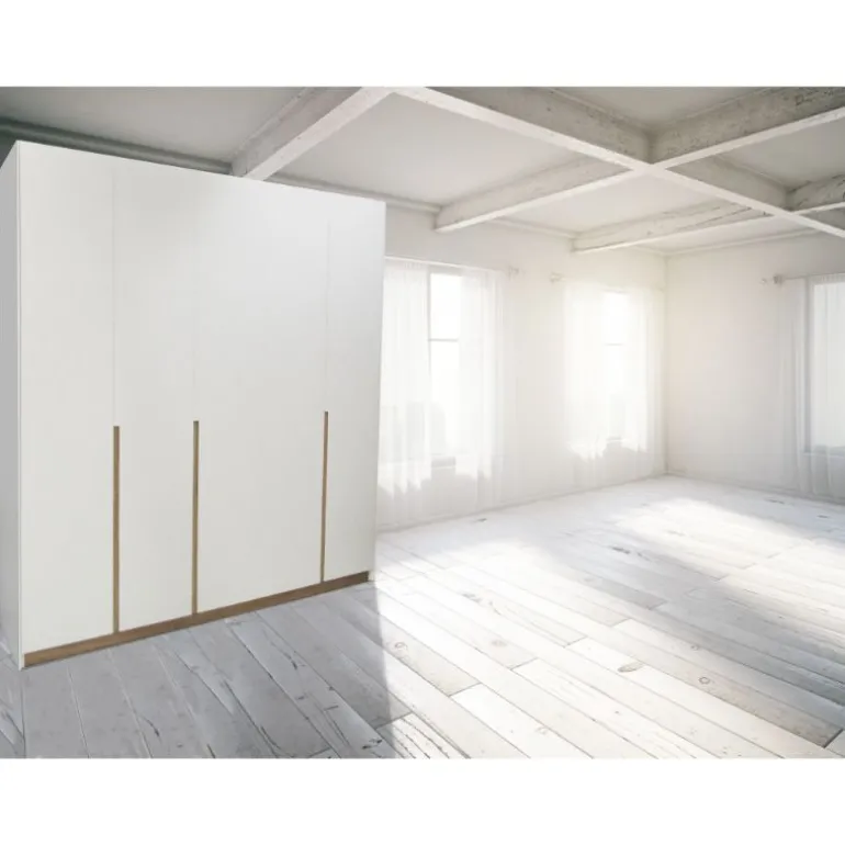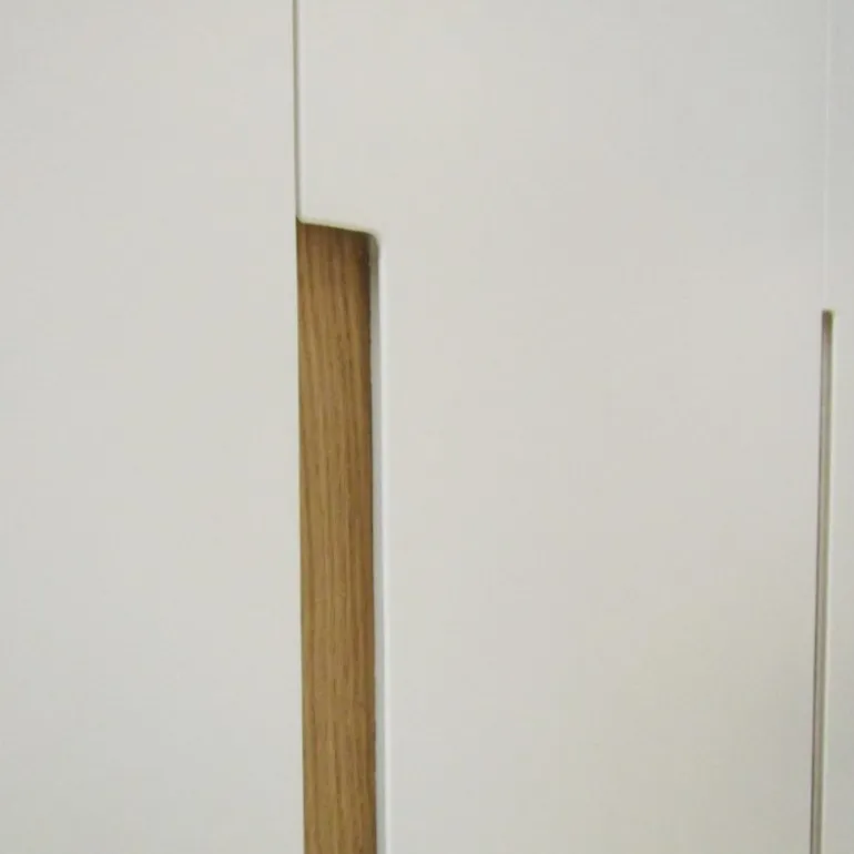 Armario Lacado blanco y Roble, de estilo moderno y la mejor calidad fabricado en LACADO PANNA MATE y TIRADORES CHAPA DE ROBLE NATURAL (es posible Lacar en cualquier color o Chapa de madera natural), que gracias a la madera de roble aporta una calidez que pocos materiales pueden dar. 5 Puertas batientes con tiradores uñeros con detalle chapa de roble, con frenos para evitar portazos.