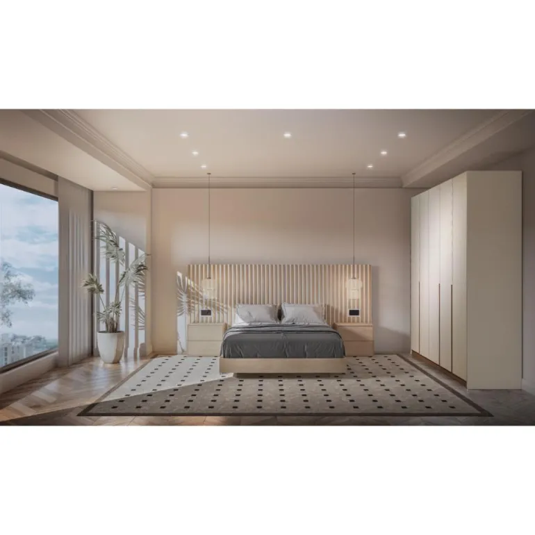 También disponemos del dormitorio completo, de gran calidad de fabricación, compuesto por un gran cabecero creado a base de listones de madera, y de un panel trasero Lacado Panna , que le aporta luminosidad. Y una bancada también en chapa de roble natural.