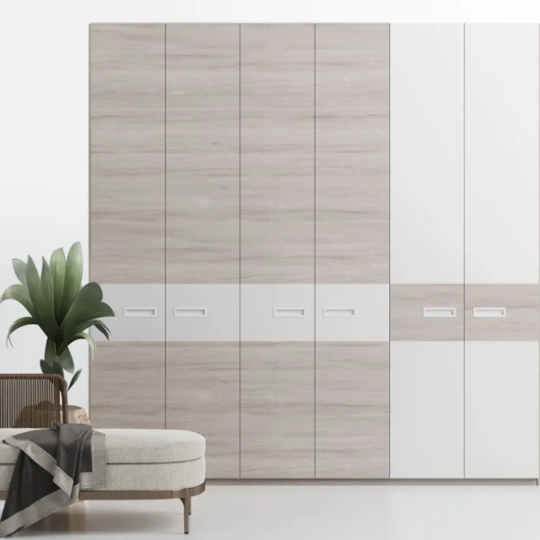 Armario Ever moderno con puertas bicolor para dormitorio de matrimonio, fabricado en ecomadera con posibilidad de personalizar entre los acabados disponibles. Un armario con una capacidad óptima y unas prestaciones a la altura.