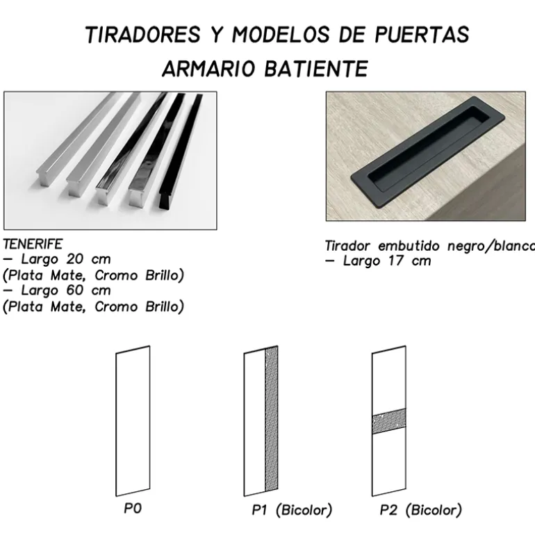 Dispone de 6 puertas batientes con nuestra puerta modelo P2 y tiradores embutido del mismo color Blanco. Los tiradores también están disponibles en Negro. Y si lo prefieres se pueden sustituir por tiradores largos de 20 o 60 cm en Plata Mate, Cromado Brillo o Negro. 3 tipos de puertas disponibles, lisa o bicolor, con Colores Base o Color Base + Color Detalle Antracita Mate.
