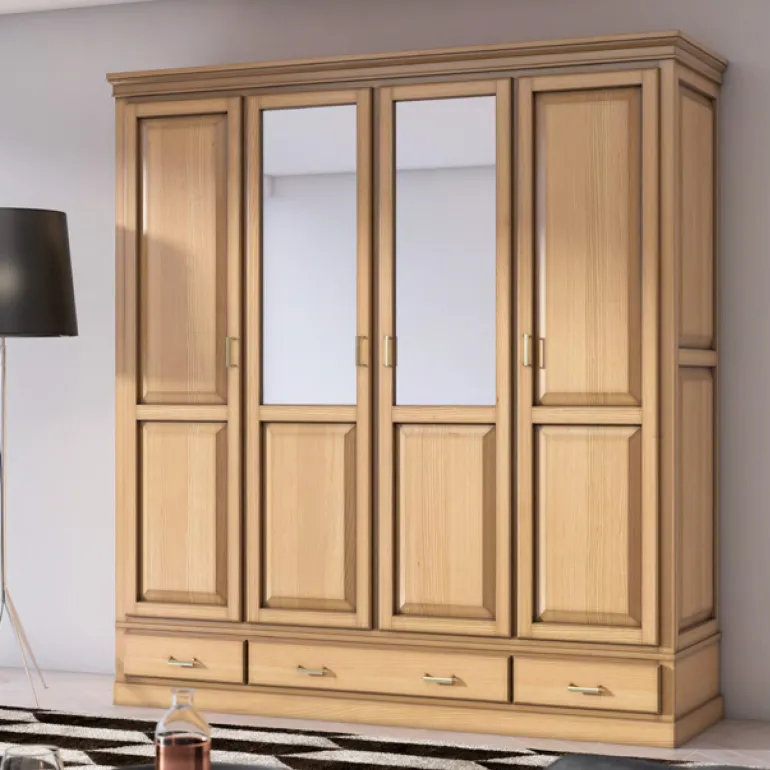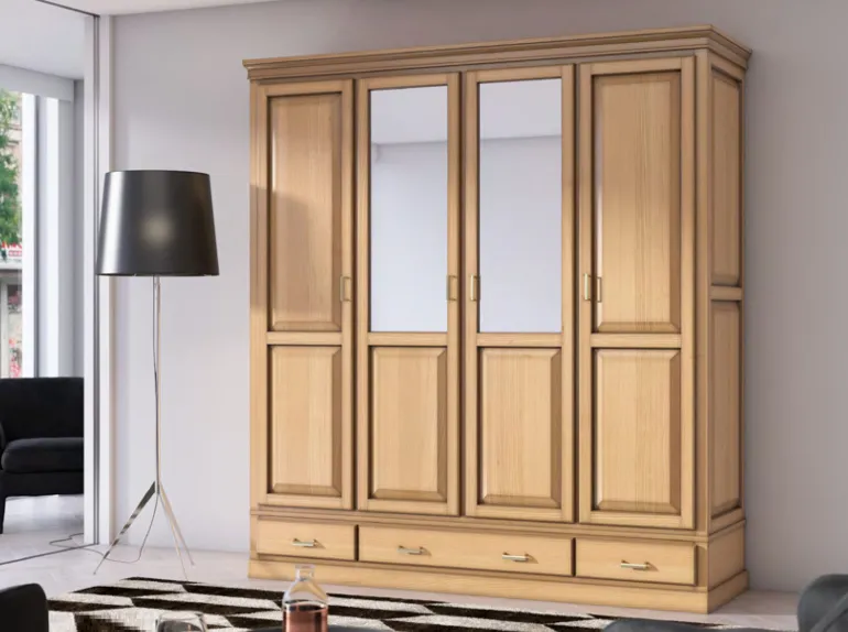 Armario con 4 puertas, dos con espejo, y3 cajones bajos. Perfecto para dormitorio de matrimonio, en chapa de Roble natural N6, que le otorga un contraste muy elegante,moderno y ligero.