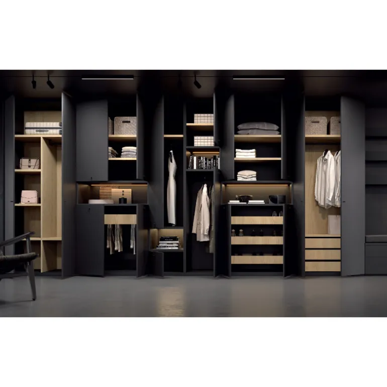 La combinación de puertas negras con interior roble, proporcionan a tu armario una elegancia y una calidez de otra dimensión. La iluminación led en los interiores de los armarios nos transmite calidez y naturalidad.