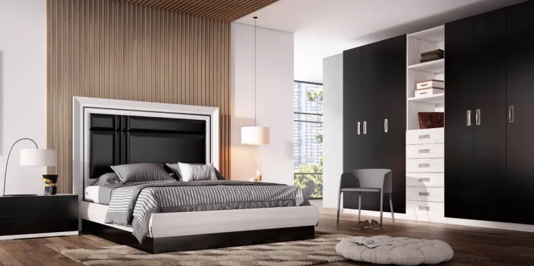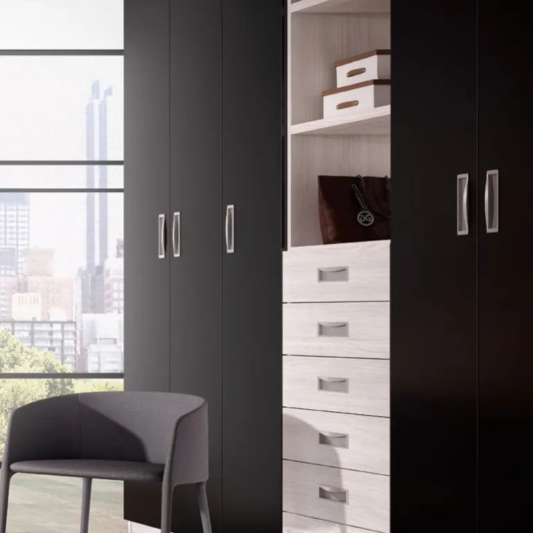 Éste armario negro, además puedes elegir la combinación que quieras: sólo ecomadera, sólo lacado, cristales en las puertas o un mix de todo ¡Crea un armario a tu gusto!