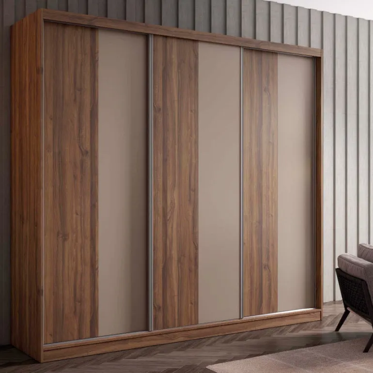 Armario puertas correderas Nogal. Este práctico armario de 3 puertas de líneas sencillas combina con todo. La calidez de la ecomadera y el toque juvenil de la laca permiten que encaje en cualquier habitación. Con estructura y puertas en eco-madera Nogal y Lacadas Volcán. Con opción de escoger en cualquier acabado disponible. Puertas nº2.