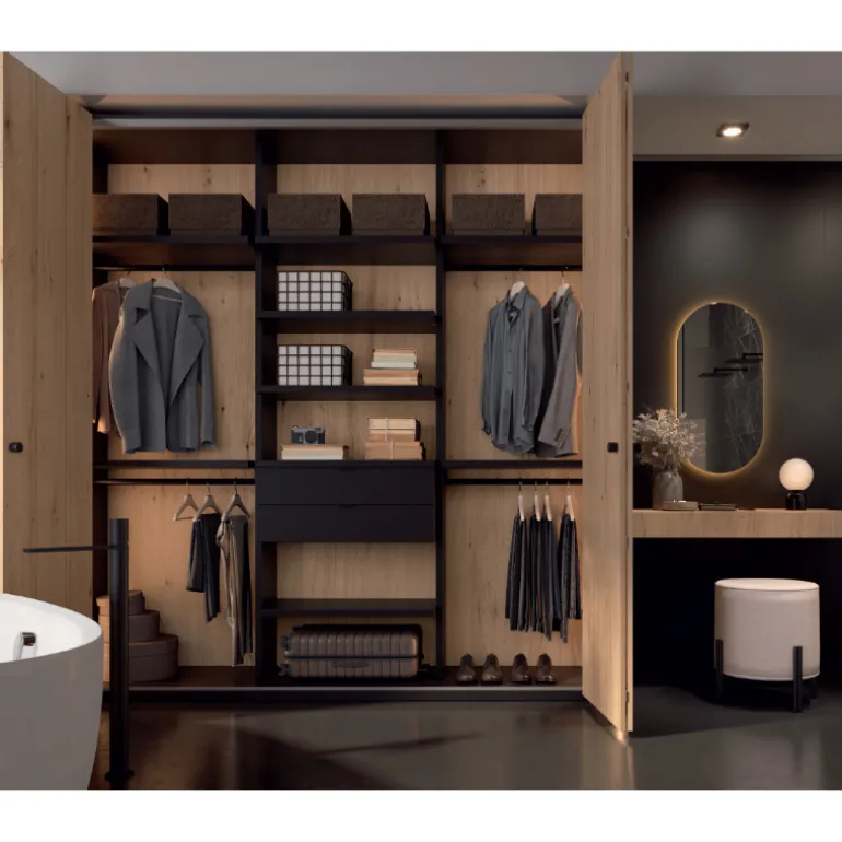El interior se compone de dos módulos con 1 balda y 2 colgadores, y el otro módulo central con 4 baldas. Acabado del interior Roble Nut (opción de cambiar de color). Posibilidad de incluir módulo de 2, 3 o 4 cajones, zapatero, o pantalonero, con incremento en el precio. Opción de añadir más baldas y colgadores.