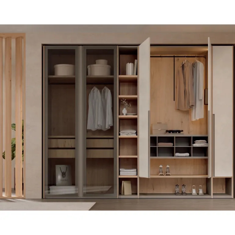 Armario único de diseño moderno y novedoso, con zona baja abierta para calzado etc. (también opción de zona alta abierta en su lugar, o con la zona abierta a diferentes alturas). Ideal para dormitorio de matrimonio de estética muy actual, formado por 2 puertas plegables de cristal, y cajonera interior, zona abierta central con baldas, y 3 puertas batientes con zona baja abierta. En una combinación de colores Roble Nut, Taupe y Pietra (Dispone de diversas opciones de acabados a escoger, y posibilidad de diferentes puertas)(opción de mezclar colores). Posibilidad de hacerlo esquinero.
