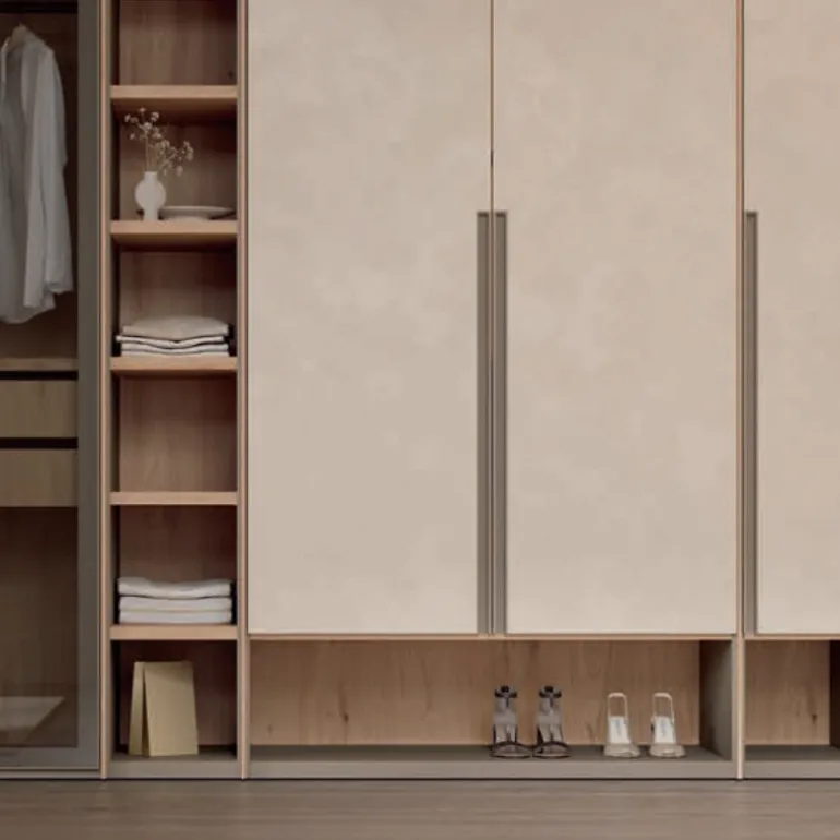 Costados del armario con ánima Allegro muy característicos del diseño Polque y también el nuevo marco de vitrina Integra y puerta de armario modelo con tirador uñero lateral (diferentes puertas a escoger).